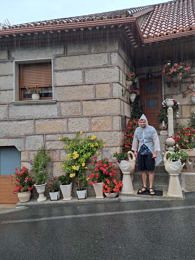 Можливо вас цікавить питання, як уберегти ноги сухими під час таких пригод. Так ось, ми провили справжнє дослідження, ми запитали абсолютно усіх пілігримів на маршруті, які мали різні засоби проти дощу. Тож офіційний результат дослідження на випадок зливи – ніяк! Можете не паритися за це взагалі. Я в перший день йшов у сандалях, але сильно натер ноги до страшних візерунків. На наступні дні знайшов більш раціональне рішення – в шкарпетках та сандалях. Кросівки треба берегти, на випадок якщо десь не буде раптом дощу, або посидіти у сухому місці із сухими ногами. Хтось із пілігримів, побачивши, що я йду просто в сандалях, сказав що це було наймудріше рішення. Але знову таки, навіть в перший день я відмітив, що фізично до дощу звик, тож не така страшна проблема, як може здаватися, але сам факт бісить, дуже бісить! Здається, що цей дощ зупиняється рівно кожний раз коли ти кудись заходиш.