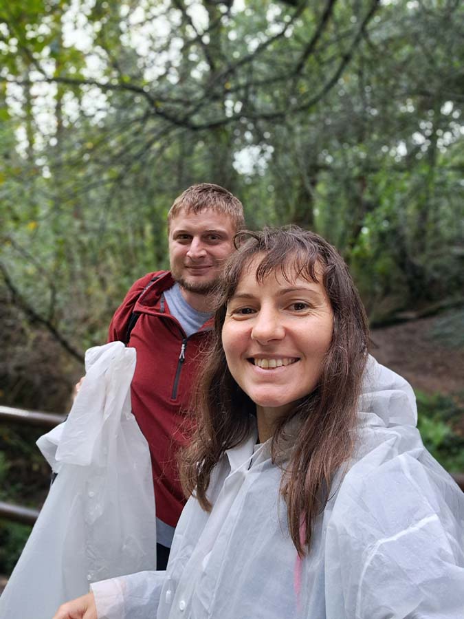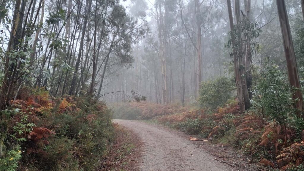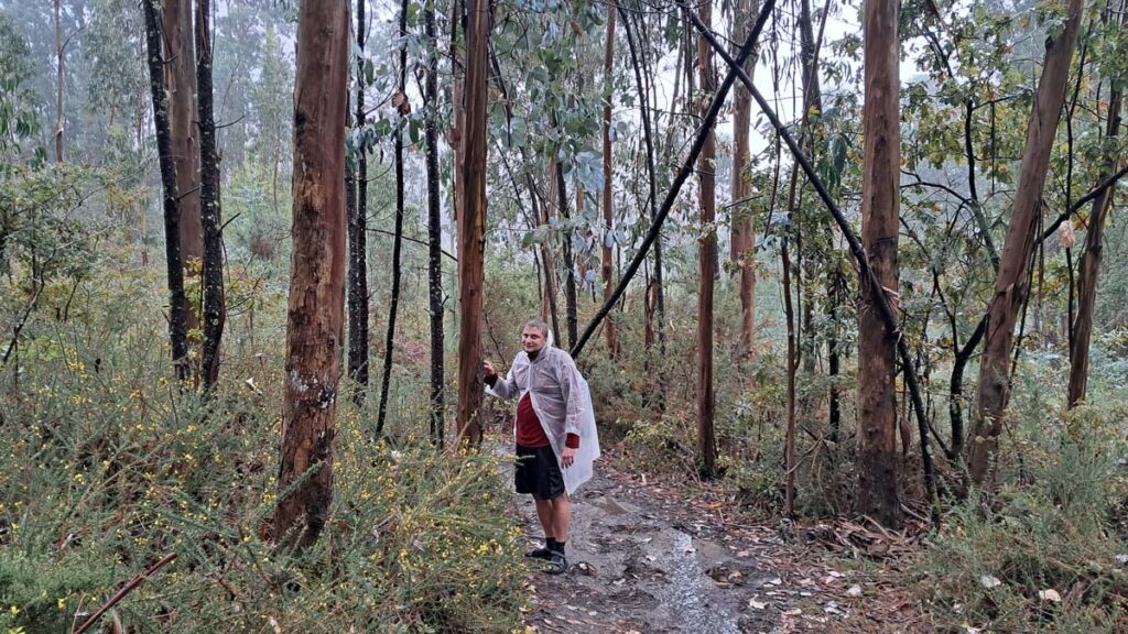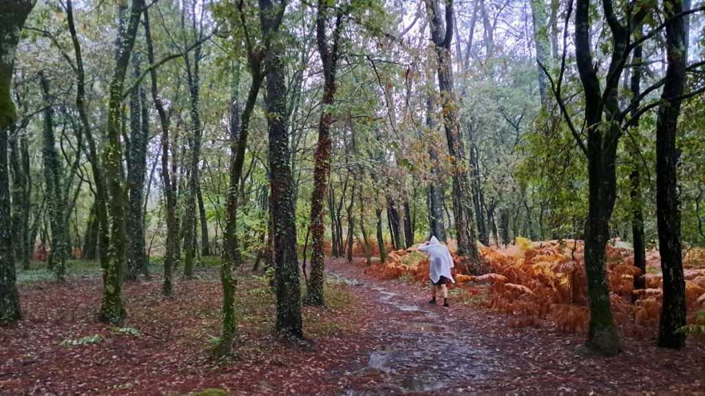 Тож ми мали просто два плащі. По потужності злива була недалеко від азійських тропічних дощів. Хочеш-не хочеш – треба йти. Ще й як на зло перетнули відмітку в останні сто км. Тож тепер на транспорті їхати не варіант. У нас заздалегідь були визначені стопери каміно – випадки у яких зупиняємо каміно. Бо був великий ризик його не пройти через проблеми з колінами Даші. Дощ, навіть тропічний, і навіть той шторм, що на нас чекає попереду в цей список не входив. На превелике щастя, в жовтні достатньо тепло, щоб не мерзнути під дощем. Відчуття було начебто ми на снорклінгу в Єгипті, але чомусь замість рибок дерева. Очі боялися, ноги йшли.