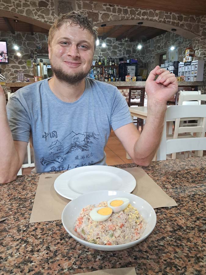 В перспективі шанси є, бо ліс та гора позаду, зараз будуть тільки міста. Але треба ну дуже добре тримати темп. Десь попереду з’являлися і зникали пілігрими, що схоже були в такій самій ситуації, бо вони йшли максимально швидко. І як не дивно, швидше за нас. Бо зазвичай у нас з Дашею прогулянки схожі на спортивний крос по швидкості. Дощик нас часами щадив, і давав нам фору. Ми просто ще не знали, що він готується до вечірнього виступу. Ще й ресторанчики усі закриті на маршруті трапляються. А хоча, он той, схоже, ще відкритий. Ми зайшли всередину, там виглядало, що працював родинний бізнес. Ми запитали дівчину чи є їжа, бо пропонувалися тільки напої. З кухні іспанською щось вигукнули і дівчина нам сказала, що за 5 євро є якась дивинна штука, що складається з овочів, але то не зовсім салат. Пояснити нам не змогла, але ми згодні, щоб це не було. За хвилину вона нам винесла величезну миску смачнющого олів’є із тунцем.
