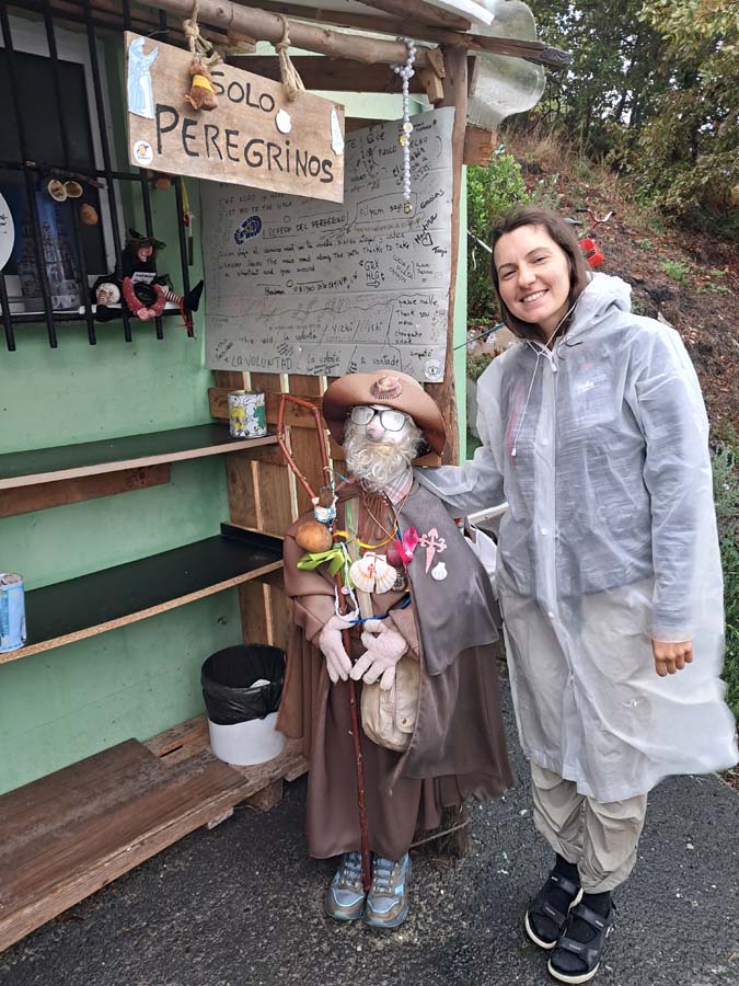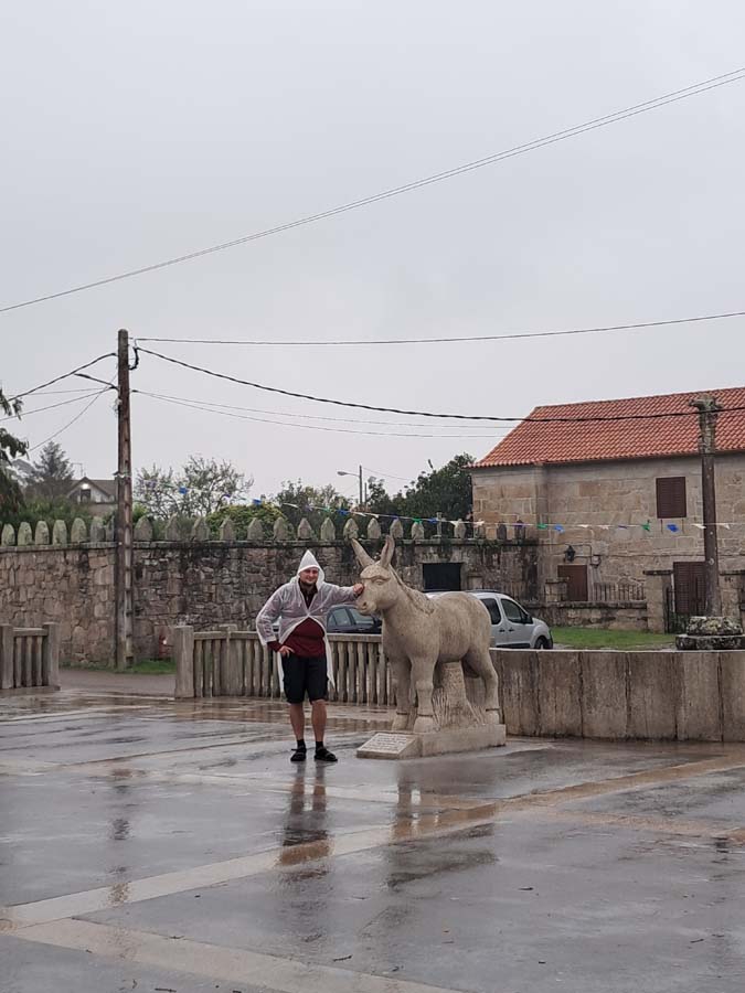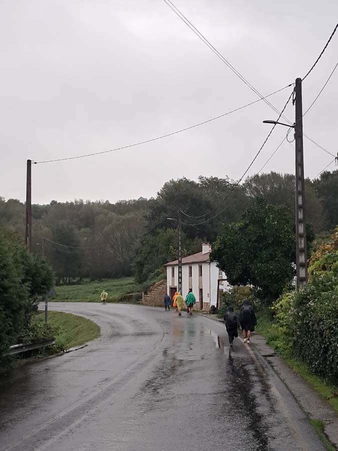 Незабаром на маршруті ми зутріли школярів, що під накриттям пропонували пілігримам купити якісь цікавинки, але нажаль, парасольки вони не продавали. А дарма, могли б в цей день собі усе навчання окупити. Далі було незвично бачити закриті кав’ярні. Дивність в тому, що на цьому маршруті сьогодні буде в незалежності від погоди рівно та ж кількість пілігримів, що була б і у сонячний день. А так вони можливо погрілися б і замовили гарячого напою. Далі, в лісах ми почали зустрічати пілігримів, всі щиро бажали одне одному легкого каміно, але не допомагало. За кілька годин організм почав звикати до дощу, як до чогось звичайного і нарешті очі почали звертати увагу на красоти навколо. Бо в дощі найбільша складність – це продовжити концентруватися на цікавостях.
