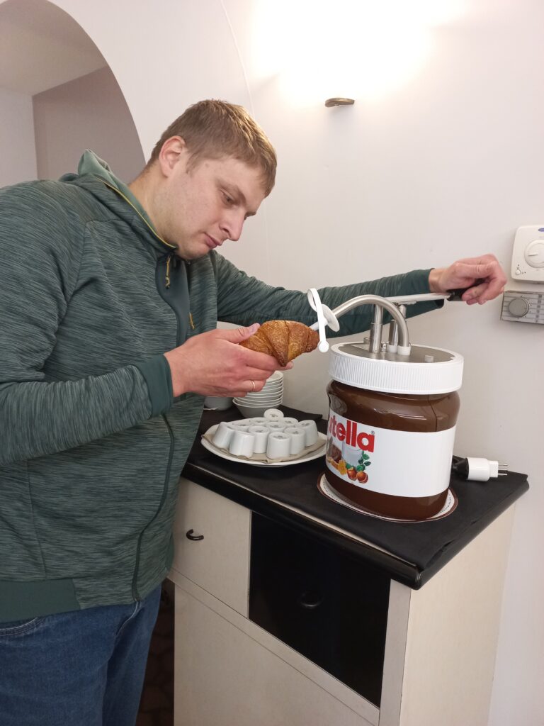 Перша зупинка була у Варені. Ми зайшли в місцевий готель випити кави. До кави подавався круасан, який треба було самому щедро заправити через насос шоколадною пастою з гігантської банки нутели.