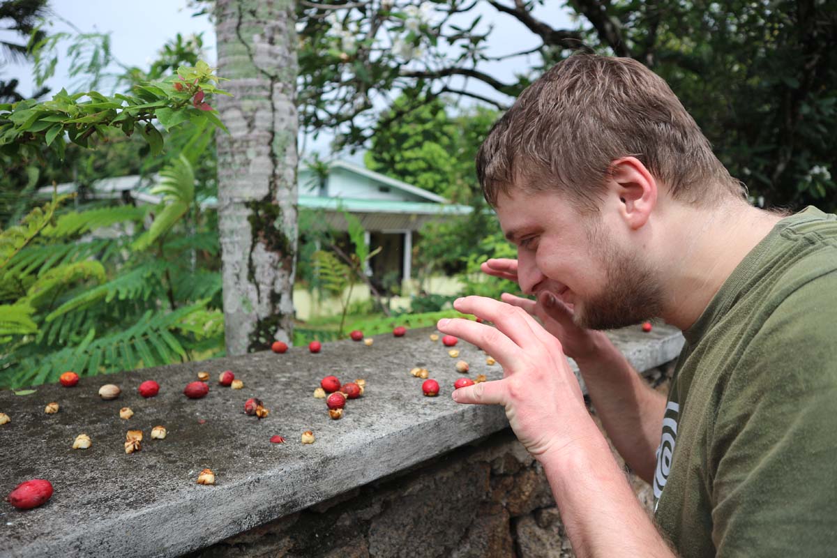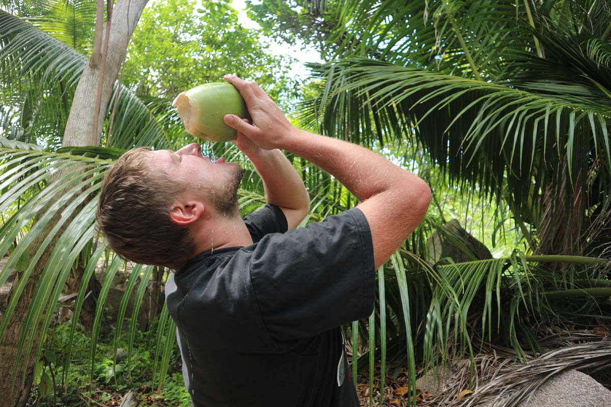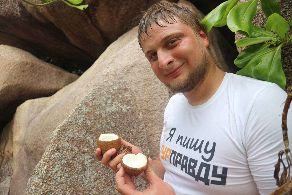 У лихі дев’яності мій тато притягнув з ринку кокос, я тоді був ще зовсім малим. Ми з мамою сіли на кухні і спостерігали як тато намагається розкрити його. Я пам’ятаю наскільки це був трудомісткий процес. Пам’ятаю, як тато розпилював його ножівкою по металу. Але зараз ми з кокосом віч-на-віч серед дикої природи, хто кого? За пару ударів об камінь його вдалося розколоти навпіл, а потім тим самим способом змогли відокремити внутрішню м’якоть. Але думка про те, що на пальмах ростуть великі питні кокоси, не покидала нас.