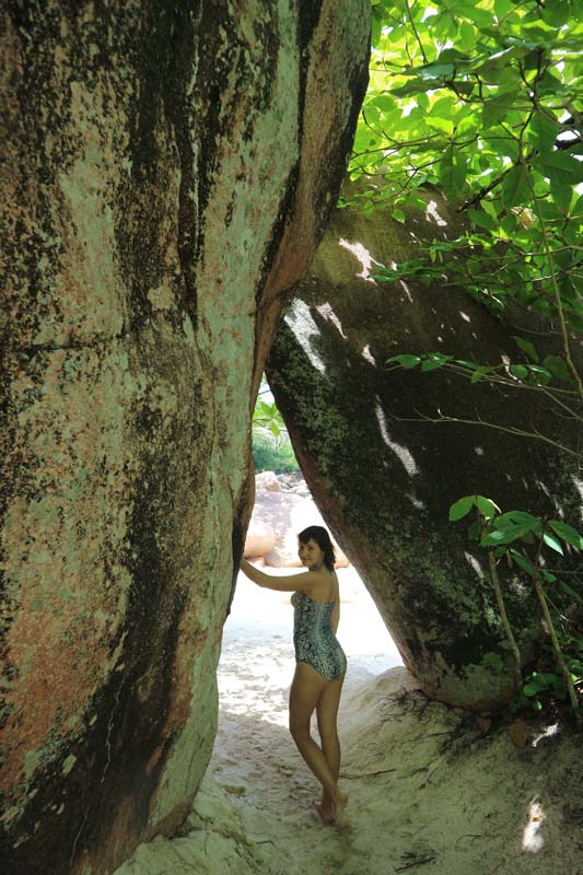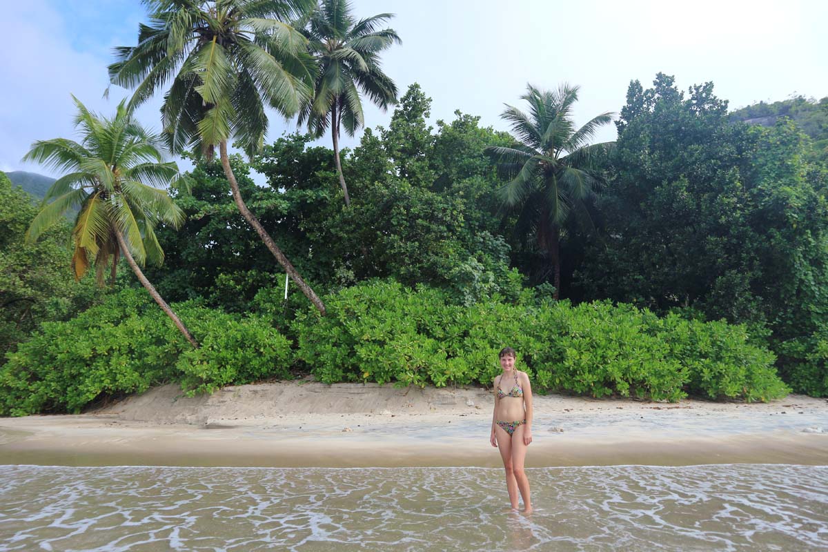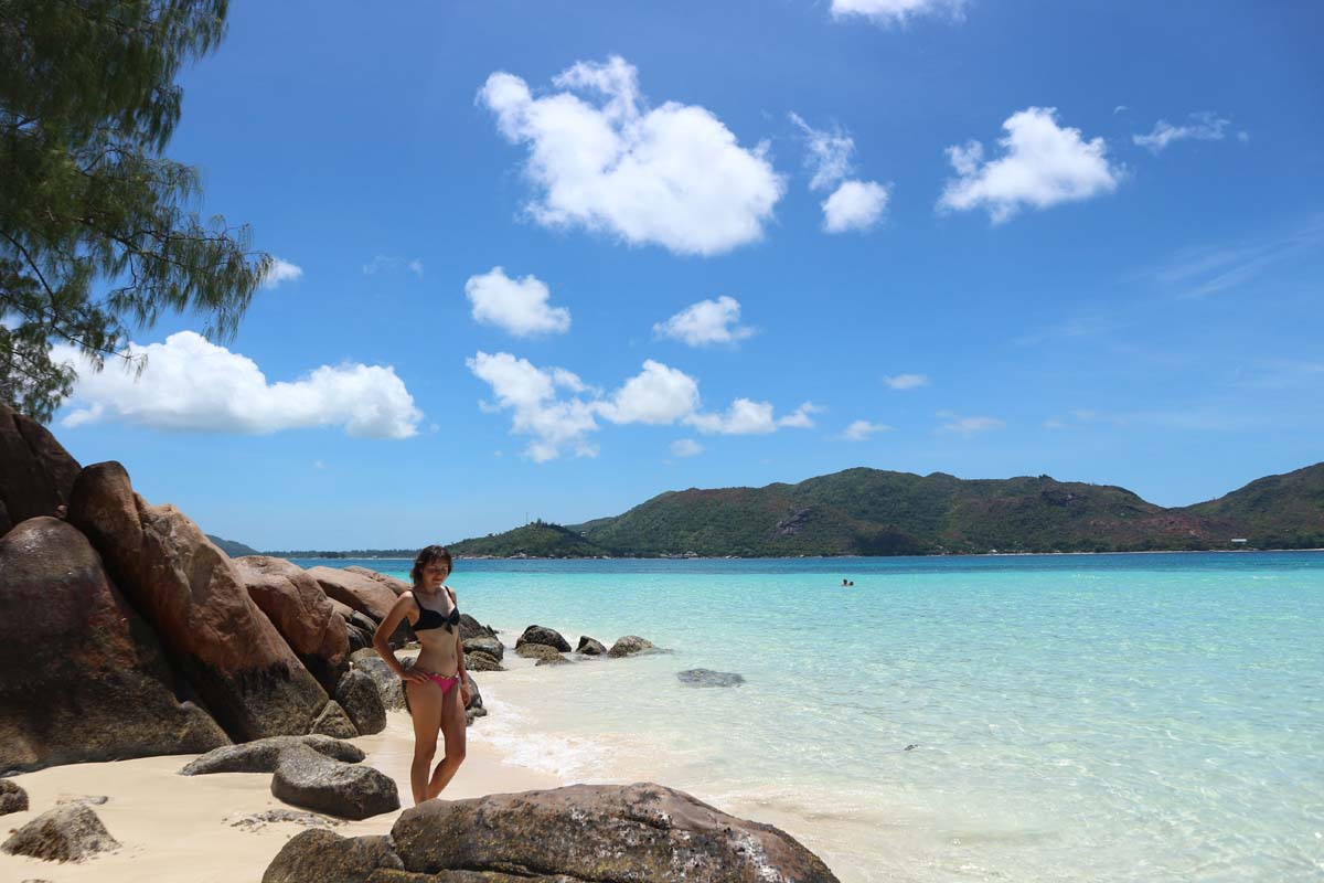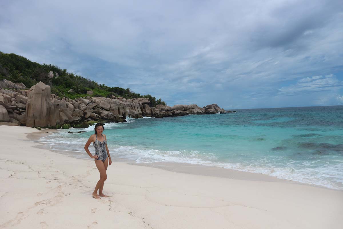 Платити треба або фізичною силою, або грошима. Наприклад, у готелі, де коштує ніч 1000 євро, гарний пляж буде відносно недалеко, та й везти тебе будуть на електрокарі. Якщо в тебе готель дешевший, то бажання потрапити на пляж необхідно довести фізично, пройшовши довгий гірський маршрут. У деяких випадках господар може зателефонувати до дорогого готелю і тебе безкоштовно пропустять через територію готелю, але наша господиня сказала, що треба дзвонити за три дні до готелю. Ми зі своєю скромною віллою лише за 59 євро за ніч відносились до тих, хто фізично доводитиме своє бажання – походом у гори. На Прасліні два головні пляжі. Один гарний, а другий ще гарніший. Який із них кращий, у нас з Дашею думки розійшлися. Є ще безліч доступних пляжів, але вони простіше. Ми почали наше дослідження з пляжу Анс Лазіо.