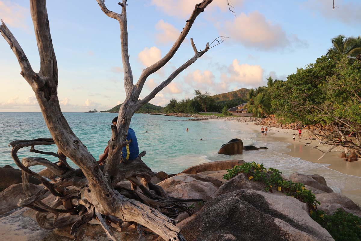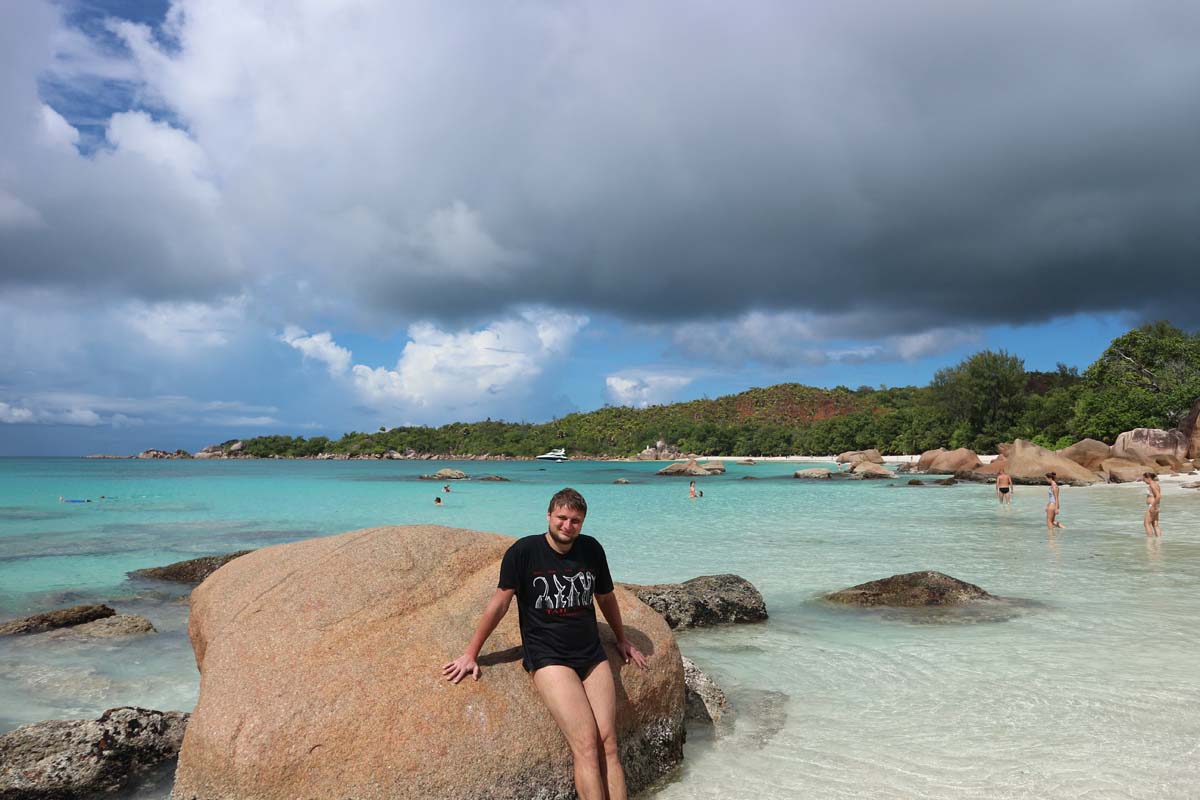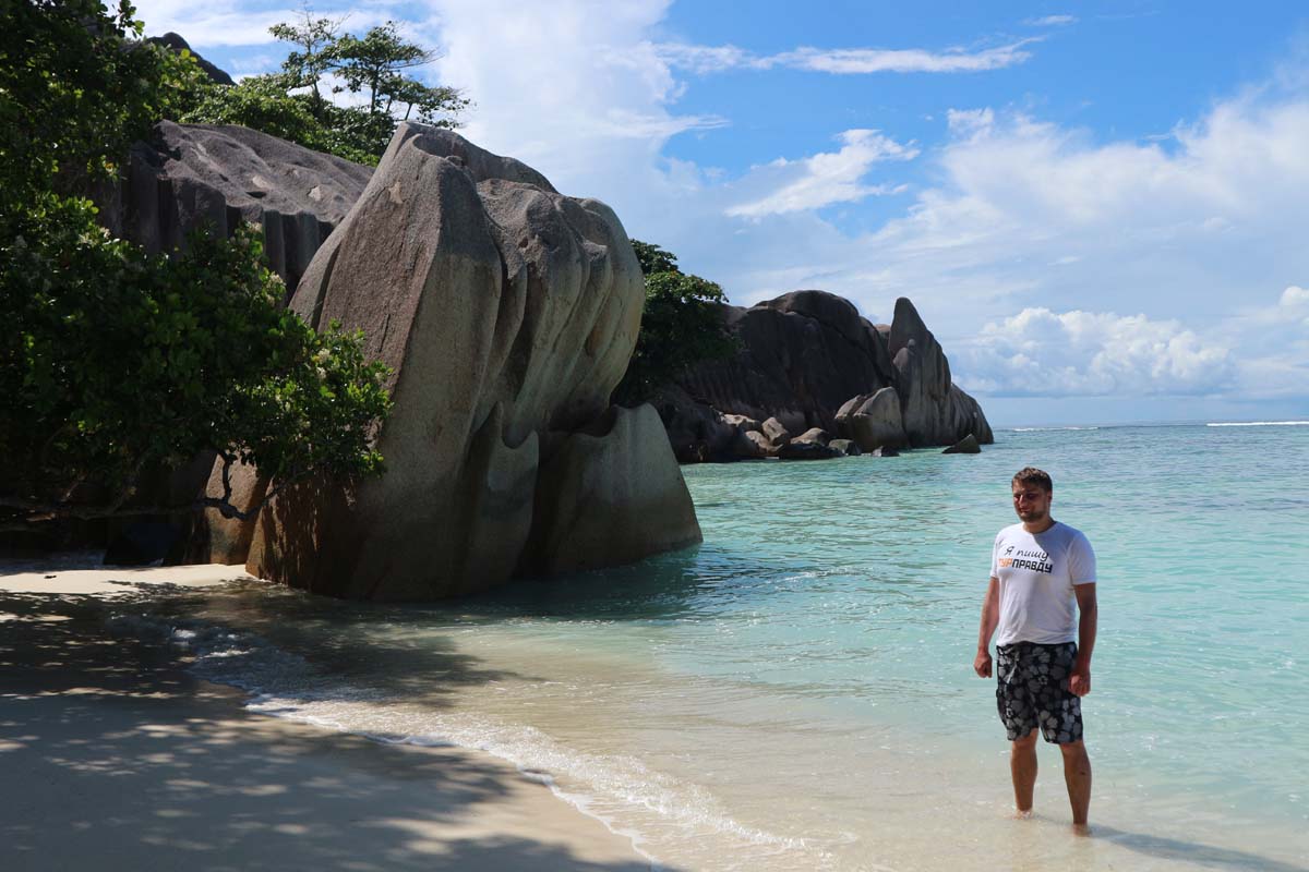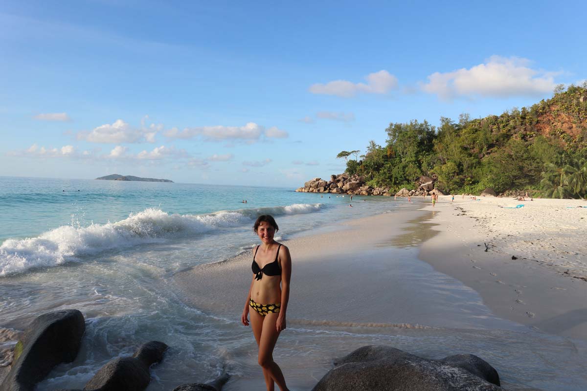Ми у Києві переймались, що на Сейшелах буде нудно. Та тут походу взагалі, мабуть, такого слова у словнику немає. Пляж у порівнянні з попереднім набагато менший. Але який він затишний і ласкавий – словами не передати. Даша відзначила цей пляж, як найкращий на Прасліні. Мій же найкращий пляж за подорож чекав нас на наступному острові. У променях вечірнього сонця хотілося нескінченно хлюпатися в сильних, але ніжних хвилях блакитного океану. Персонал готелю готував столик для романтичної вечері. Дорога назад була досить короткою і без гір оскільки можна було вийти через чудову територію дорогого готелю. На Прасліні є безліч інших доступних пляжів. Але в будь-якому випадку Анс Лазіо і Анс Жоржетт дуже і дуже красиві і їхнє відвідування варте всіх труднощів добирання. На цьому пляжі із кінцями забув одну зі своїх улюблених футболок.