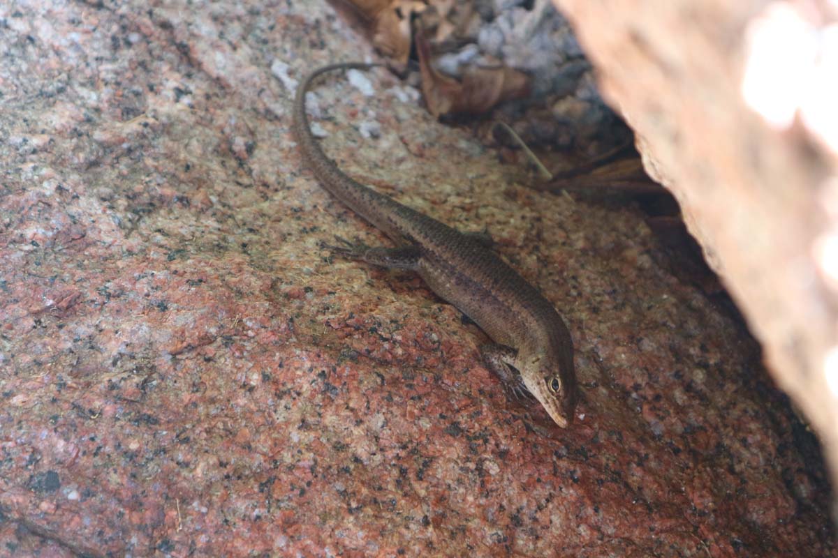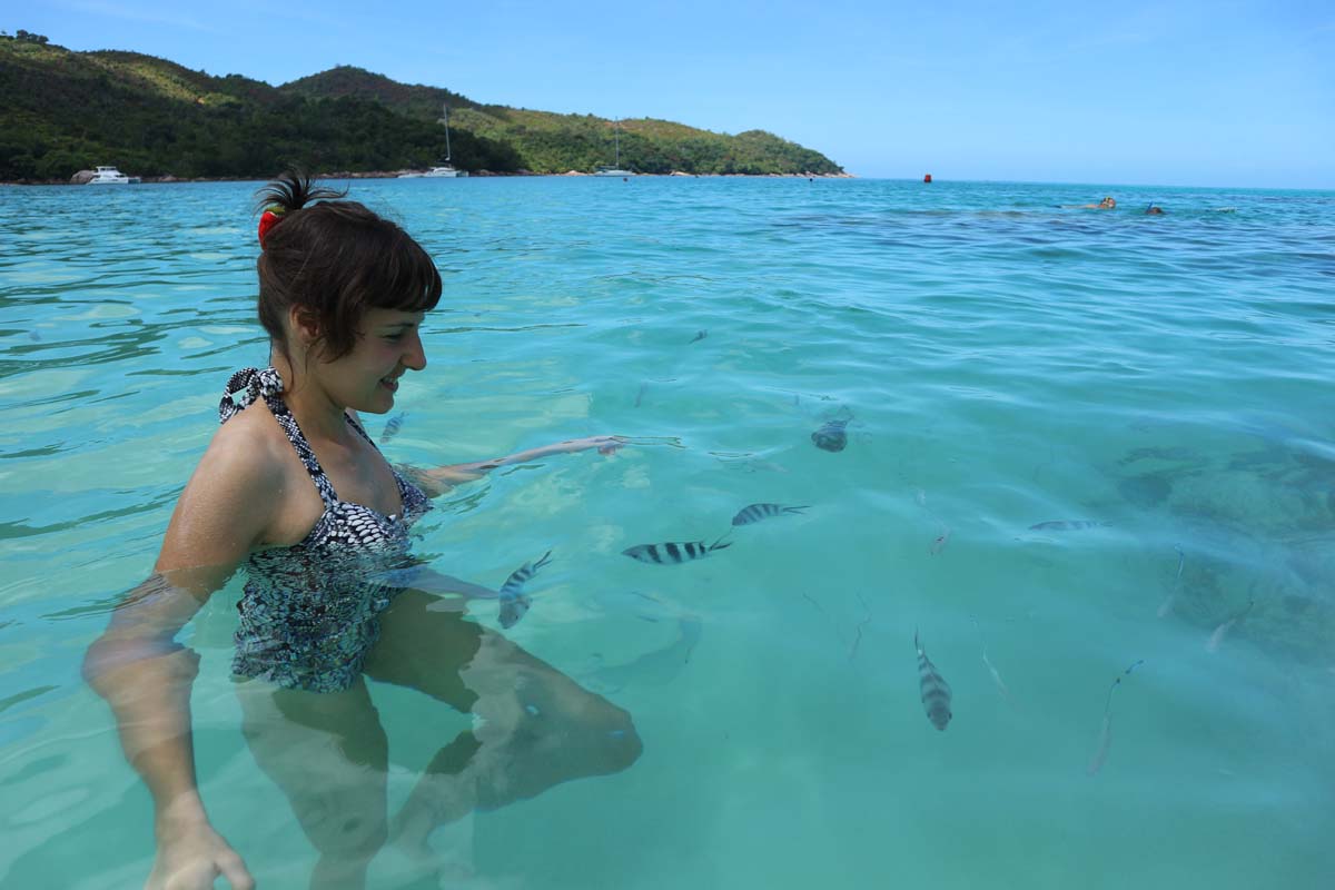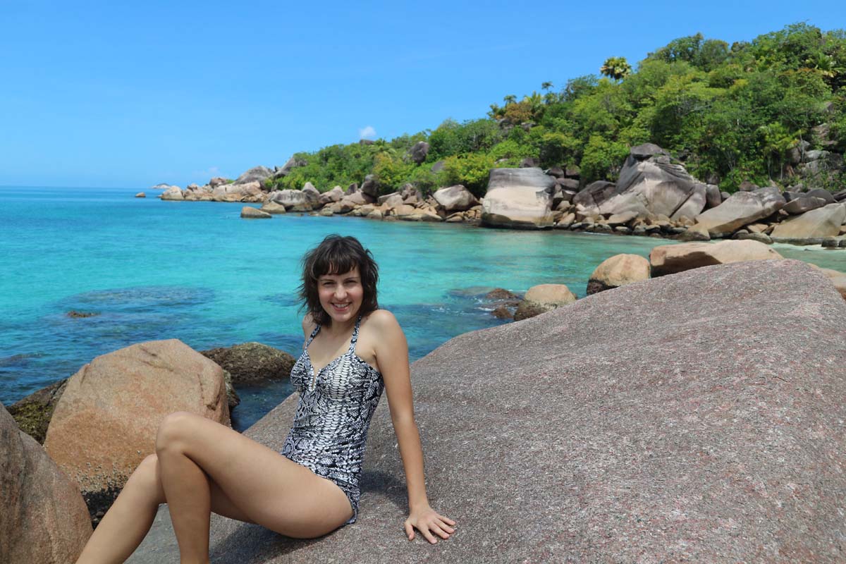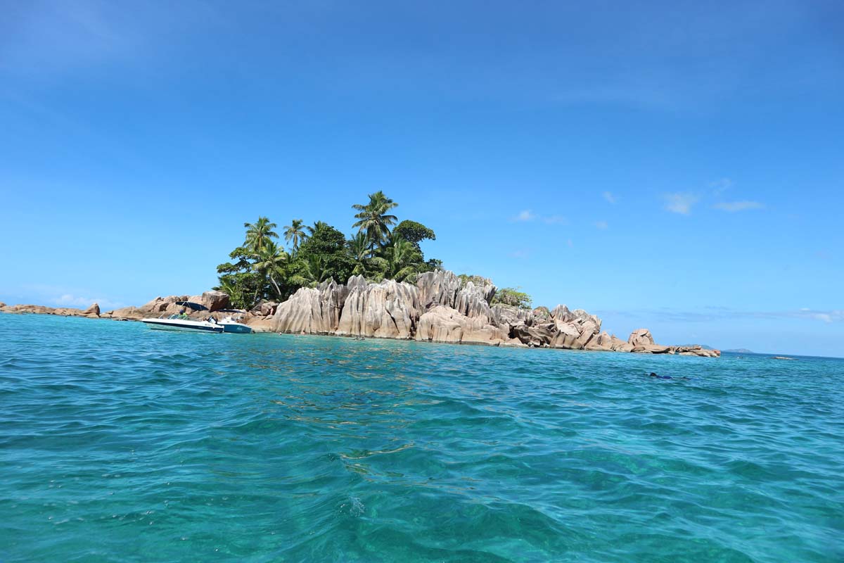 Напевно, це є найменший з островів на котрому ми колись були. Нам видали маски з трубками та пообіцяли за годину забрати. Години вистачає, щоб у хвилюючій воді не поспішаючи пропливти по колу. Водний світ Сейшел поступається Мальдівам та Єгипту. Скажімо так, різновиди рибок на висоті, але немає великої кількості коралів. Точніше, їх взагалі практично немає. Можливо, на якихось віддалених островах є рифи, але це явно не на околицях основних островів. Але навіть без коралів було дуже красиво поплавати серед кам’яних брил і купи гігантських риб. Розміри риб тут вражали. Хвилин за 45 ми зробили повне коло та видерлися на вершину острівця. На цьому острові царство ящірок та павуків. Одна з них з цікавістю зазирала в нашу сумку. Павутиння з павуками чітко позначали куди на острові йти не треба.