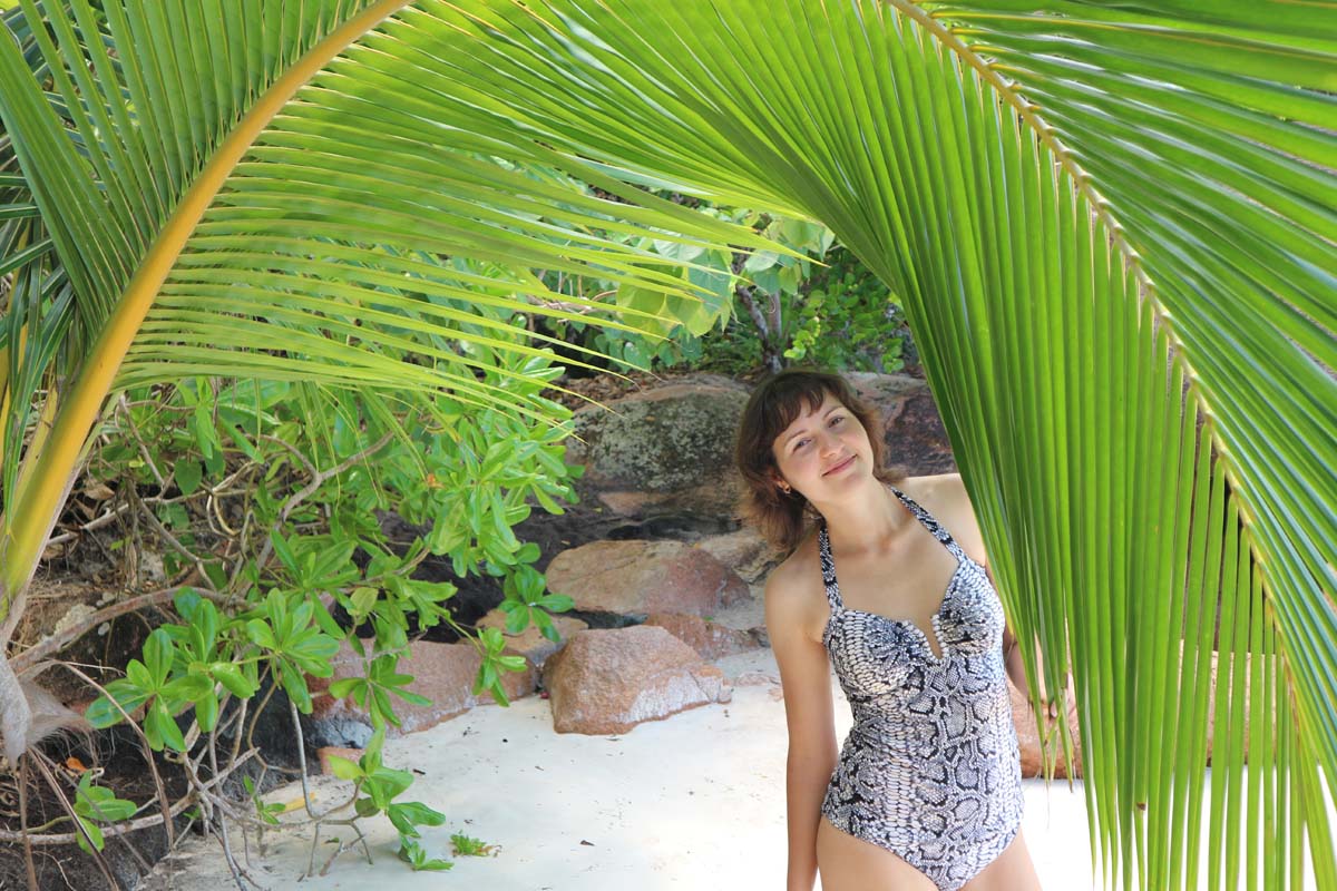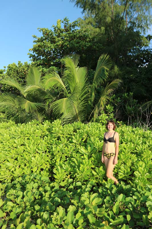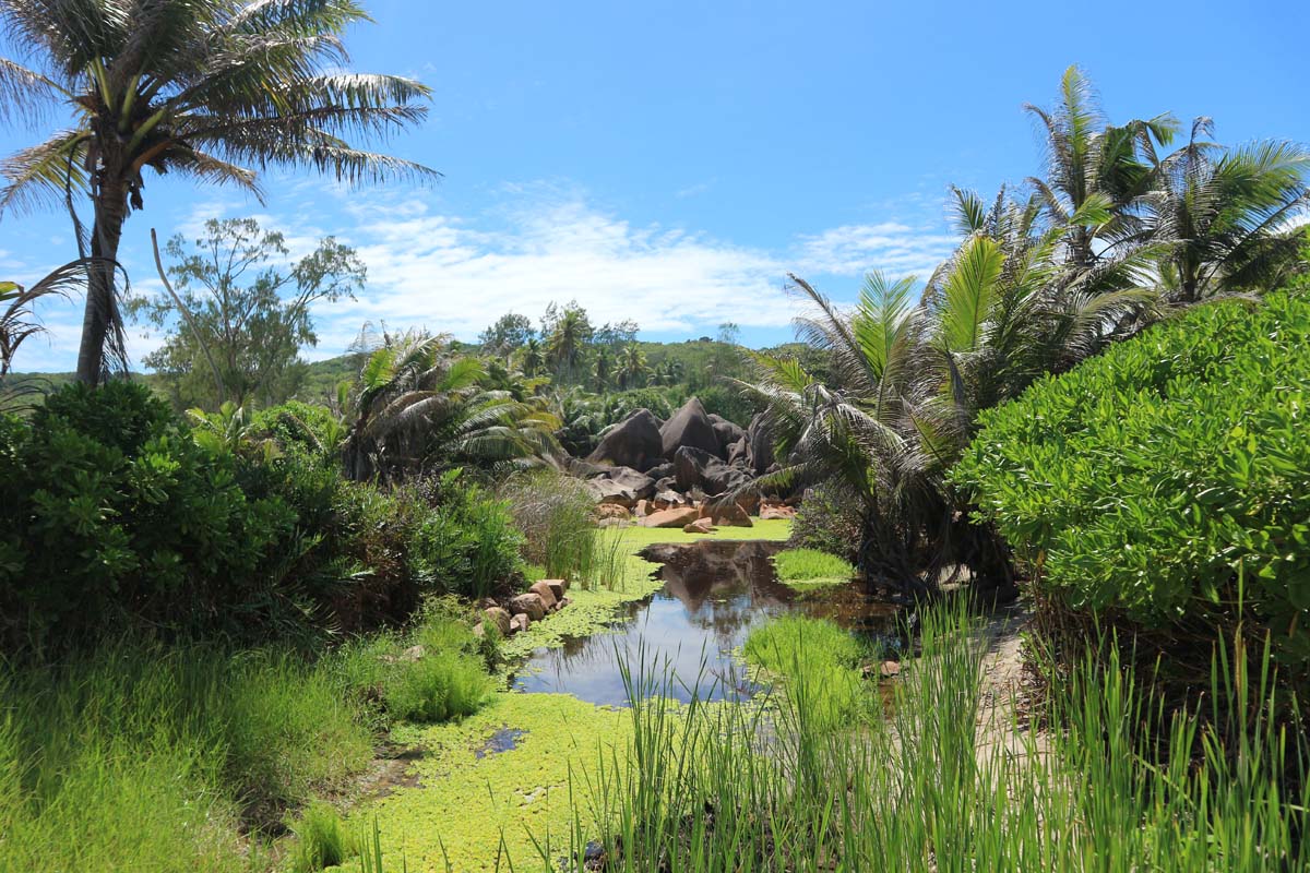 Сонце сьогодні було надзвичайно яскраве. Я трохи переживав як би сонячний удар не зловити. Першим на маршруті був пляж Анс Петіт. Людей тут було ще менше. На пляжах місцеві креоли крутили екзотичну ненапружену музику, міксували коктейлі та спорудили безліч відокремлених альтанок з листя та гілок. Ми ж вирішили дістатися найвіддаленішого пляжу Анс Коко. Ми йшли через озера, каміння, гори, знову гори. Шлях був довгий і дуже спекотний.