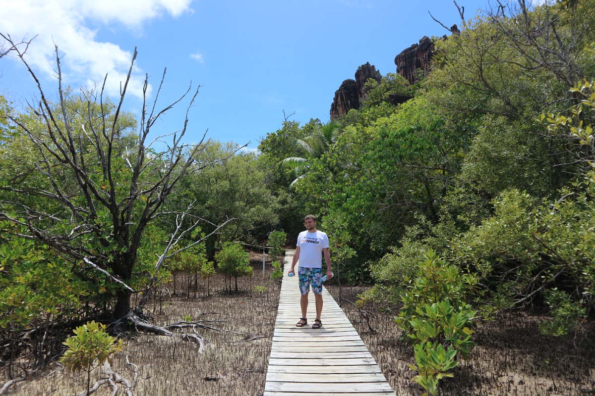 Крім черепах, тут були туристи від різних компаній. Судячи з коментарів в інтернеті, деякі платять по 150 євро з людини за цей тур, але з барбекю. У растаманів я бачив, що з Барбекю ціна 60 євро. Нагулявшись із гігантами, ми пішли на трек маршрут. Він був практично без гір, по дерев’яних містках. Потрібно було пройти близько двох кілометрів. Доріжки були на висоті одного метра над землею. З землі стирчали тисячі дрібних шипів. Це молоді мангри проростають.
