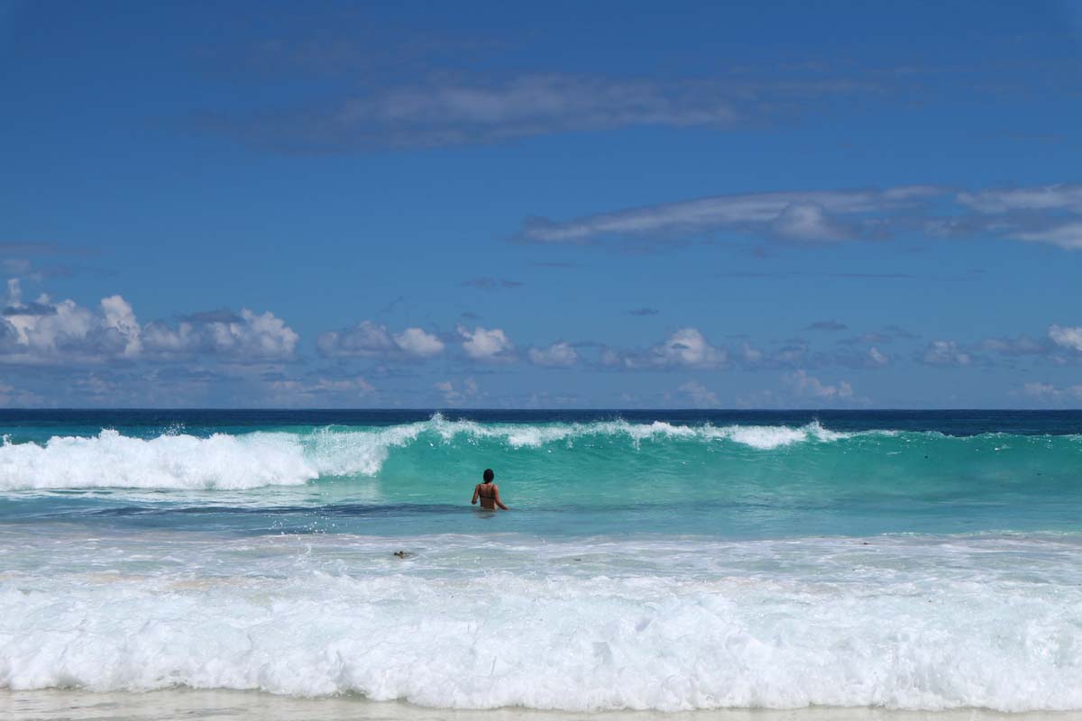А попереду на нас чекав Анс Гранд. У нашому рейтингу пляжів острова Ла Діг він посів найвище місце. Тут індійський океан показує всю свою міць і неосяжність. Найпотужніші хвилі чистої та гарної води обрушуються на берег. Вся картина відбувається на тлі таблички, що забороняє купатися. Але це лише підігріває інтерес. Ми не роздумуючи побігли до епіцентру.