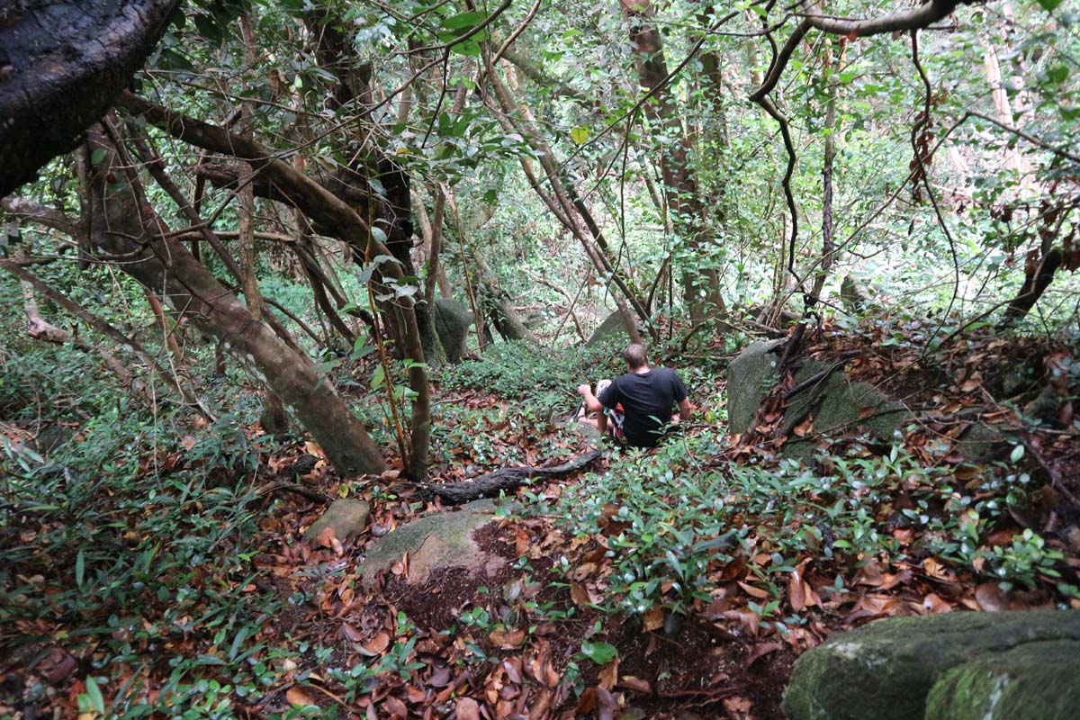 До нас назустріч з інших чагарників прорвалися подряпані брудні туристи та розпитували наскільки складно було йти нашою стежкою. Хоча стежками тут уже навіть і не пахло, але ж туристи якось сюди потрапили. Дивлячись на пунктирну лінію карти, починаєш знаходити серед кущів відмінні риси, що можуть зійти за доріжку. Але мені зараз здається, що це вже уява грала з нами. Нам треба було пройти більше кілометра до роздоріжжя, а потім вийти на іншу стежку до пляжу Анс Коко. Тішило, що дорога починає йти вниз. Розуміння того, що дороги ніякої немає, прийшло в той момент, коли піднятися назад було практично неможливо через нахил і каміння, яким було так легко спускатися. Треба було дістатися до низу та вийти на асфальтовану дорогу. Весь час спускатися вниз не вийде, оскільки потрібні дерева, щоб триматися них. А часом трапляються вертикальні перепади висоти метра по три. У результаті завжди треба було йти петлями. Я схопився за якусь екзотичну рослину і долоні почали пахнути зірочкою. Узвіз був не дуже зручним. Багато де лазили гігантські черв’яки із сотнями лапок. Це надавало перчинки у спуску. Ми почали знаходити знаки у їхніх позах. Ось два хробаки, які явно показують нам цифру 12, а ось ще парочка, вони показують 23. Але розгадати цей код нам не вдалося.