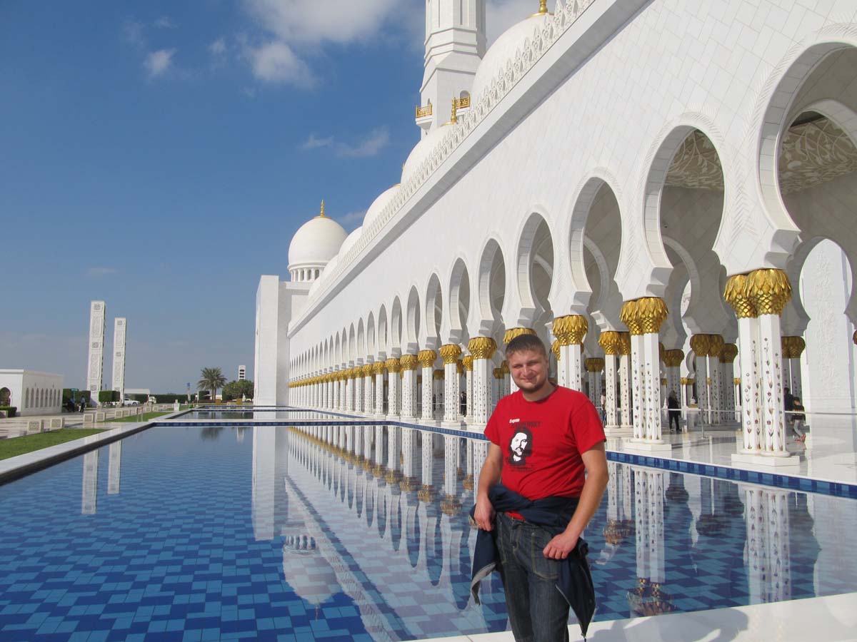 За фактом станція не особливо красивіша за низку київських станцій. Під’їжджаючи до нашої станції, я зрозумів, що метро безпілотне! Це було приємне відкриття для мене. Я вже не раз запитував себе, яке завдання у машиністів нашого метрополітену? Або ще краще питання, яка роль бабусі — водія фунікулера? Але схоже у нас просто вшановують традиції) Вийшли ми на своїй зупинці, але в перший автобус не помістилися, наступний під’їхав хвилин через 15. Далі провал у пам’яті, ми прокинулися приблизно через 2 години вже на під’їзді до автовокзалу Абу-Дабі. Автобус коштував за двох 70 дирхам (19 $) з урахуванням карток. Супер! Ми доспали ще повноцінних дві години і тепер найтонкіший момент позаду, адже якби не вдалося поспати в літаку і автобусі, то найближчий сон можливий був би в літаку до Києва через 23 години. Далі треба було поснідати, на автовокзалі якраз підвернулася ліванський ресторан. Цікаве відчуття приїхати в емірати та куштувати ліванську кухню. Дуже ефектно робили каву, наливаючи в нього молоко з великої відстані тонким струмком з металевої банки. Заплатили якось ми зовсім не дорого, хоча перед поїздкою був страх, що на їжі ми розоримося в еміратах. Дуже складно з’ясувавши який автобус їде до мечеті, нам довелося купити чергові проїзні картки. У нас у кишені вже було більше карток, ніж у колекціонерів бейсбольних карток. Чого ми затіяли весь цей маршрут із виходом в еміратах? 2,5 роки тому летячи на Шрі-Ланку авіалініями Airarabia ми подивилися рекламу розваг в ОАЕ, у програмі була просто невимовної краси біла мечеть, так само була ще купа всякого, але в порівнянні з мечеттю то дрібниці. Ось власне її ми і поставили головною метою цього разу. Тим часом вищезгадана мечеть з’явилася на горизонті.