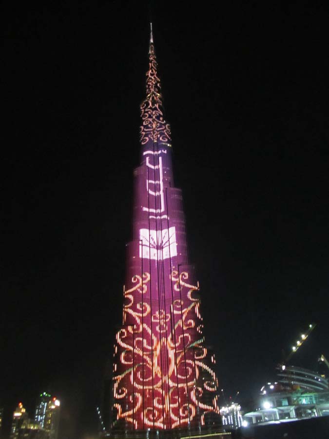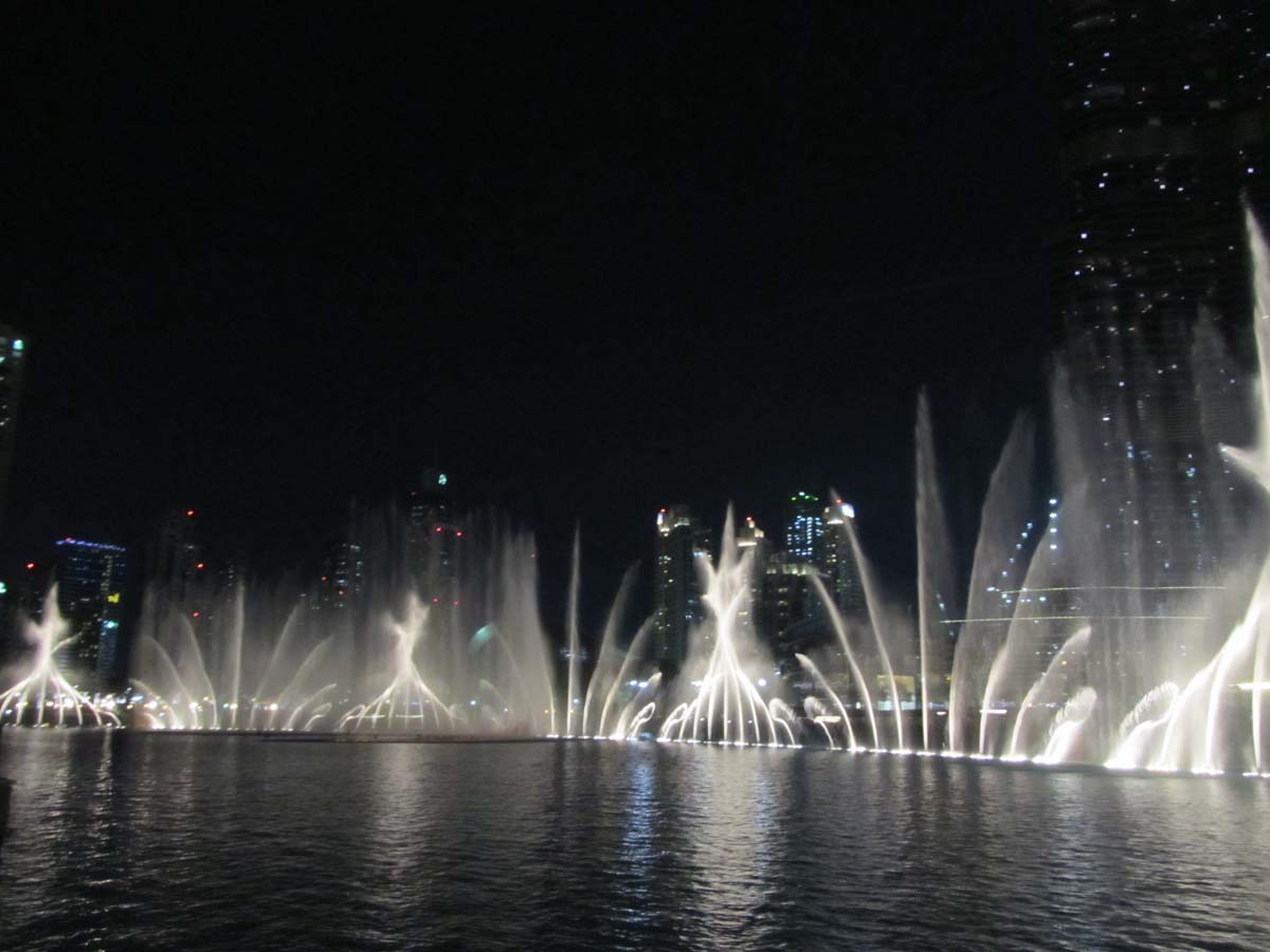 З минулого разу залишилися не відвідані кілька пунктів, одним з яких був знаменитий фонтан. Зараз був час з’ясувати, чи буде крутішим дубайський фонтан після побаченого в’єтнамського. Від метро довелося добряче протопати переходом у великий мол. Вийшовши з молу на вулицю, ми опинилися біля підніжжя вже знайомої нам Бурдж Халіфи. На всю висоту світилися різні візерунки та інші спецефекти. На вулицях штучних островів уздовж фонтану збиралися люди, причому концентрація була не дуже великою, пересуватися можна було спокійно. Фонтан танцює кожні 30 хвилин і ось починається шоу.