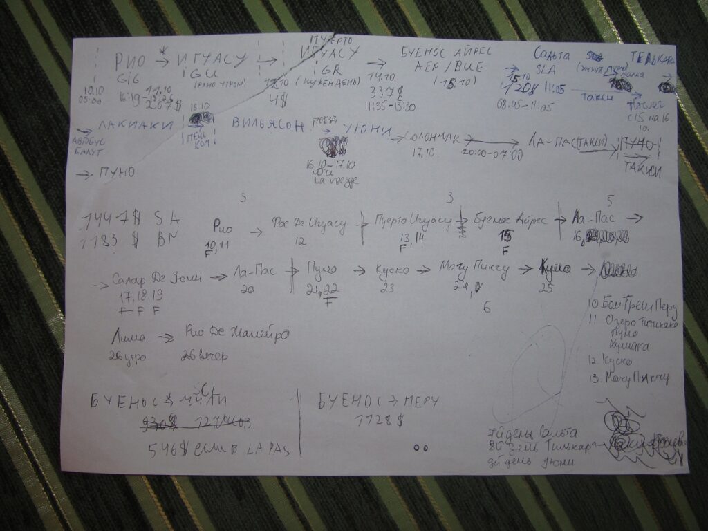 У дужках вказано назви аеропортів. Квитки купували просто на сайтах цих авіакомпаній. На сайті LAN виявилася проблема з покупкою через картку Mastercard, довелося скористатися сервісом Paypal, який додатково обікрав картку на 40 $, факт крадіжки встановлено банком, але довести нічого не вийшло.