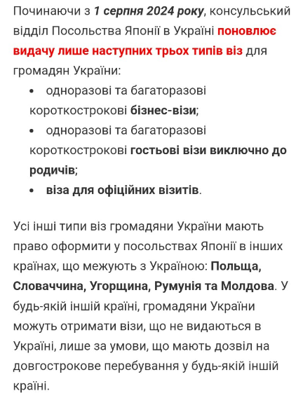 Станом на 2025 рік, посольство Японії в Україні не видає короткострокові візи із туристичною метою. Натомість можна звернутися в посольство Японії у Варшаві.