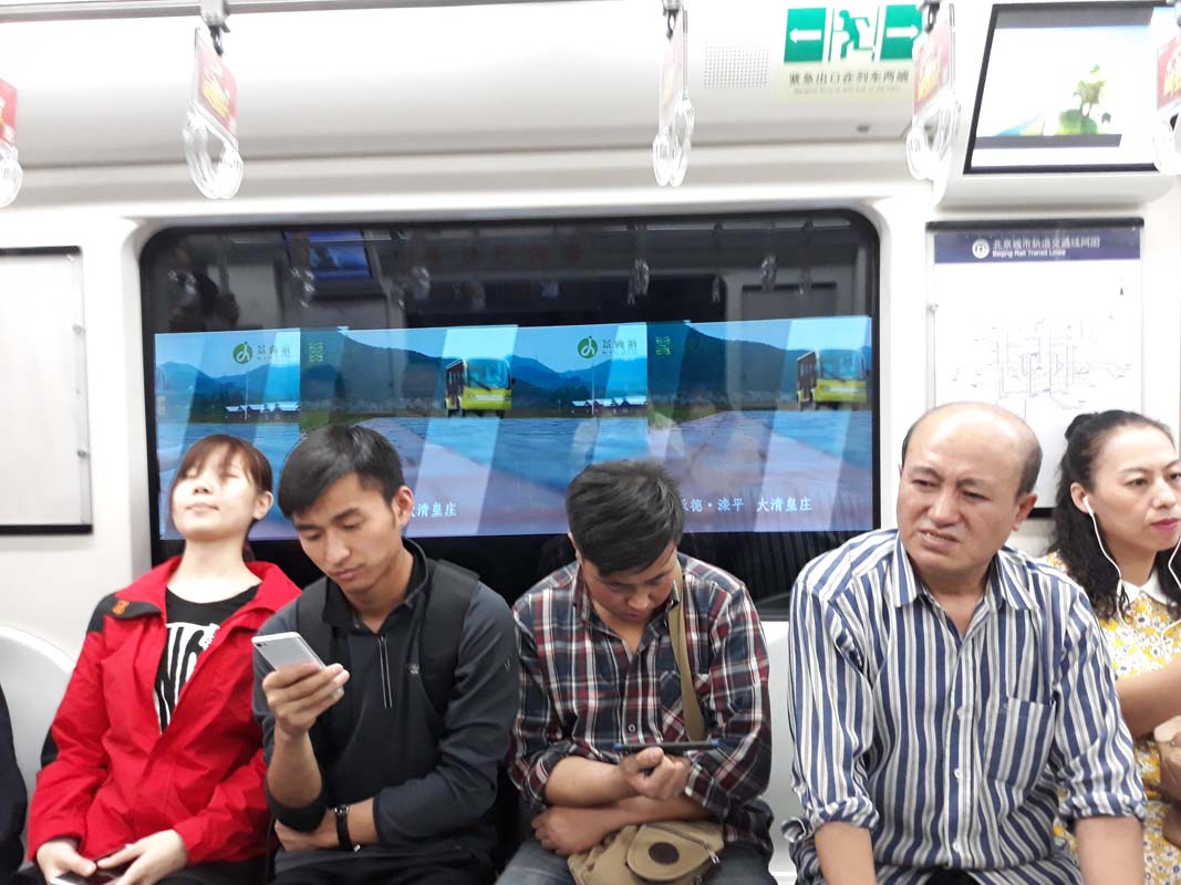 Насправді тут було важливо з’ясувати чи працює система з явною проблемою в логіці на користь пасажирів, які потрапили в цю логічну петлю. Працює! Та й фінальна демонстрація довжини метро була у наш останній день, коли ми в Пекіні за день проїхали понад 50 станцій. Найцікавіше відбувається у самих вагонах. На станціях розкреслено зони входів та виходів із вагонів. Вагони завжди зупиняються в тому самому місці навпроти розсувних дверей. Входити у двері треба зліва та праворуч, а пасажири виходять по центру. Але коли відчиняються двері вагона починається регбі. Завдання пасажирів, що входять, зводиться до того, що треба не дати вийти тим, хто приїхав. Завдання приїжджих полягає в тому, що треба пробитися крізь плечі, що тиснуть з обох боків. Вхід і вихід відбувається одночасно через вузькі двері в три потоки – два вхідні та один вихідний. У самому вагоні починається новий вид спорту — біг у стилі “Рись” або “Шанхайський барс”. Хто перший добігає до місця, той і сідає. Наприклад, сидить увесь ряд, вагон напівпорожній, стоять небагато. На початку ряду перед тобою звільняється місце, шанс сісти на таке місце практично нульовий, адже китаянка, яка стояла наприкінці ряду, вже взяла розгін і встигне сісти навіть якщо ти вже почав маневр сідання. Або схема тетріса. Перед тобою звільняється місце і довгий ряд зі швидкістю світла зрушується так щоб китаянка з іншого кінця ряду не бігла.