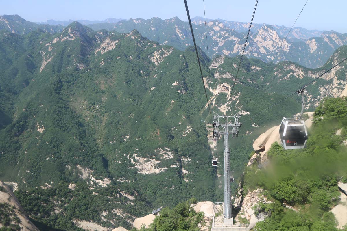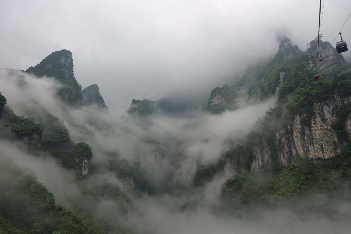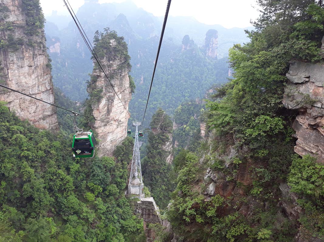 Почалося довжелезне піднесення в гори в особистому вагончику. Якийсь китаєць, звичайно, хотів до нас залізти, але я йому жестом показав, що він за 20 секунд може сісти у свій особистий. Спочатку було просто красиво і високо, потім дуже красиво і дуже високо, а потім відкрилися види над “нескінченними” висотами з дивовижною красою. Ми так високо ще не були не на одній канатці. Щоб ми могли більше насолодитися красою гір, канатка зупинилася.