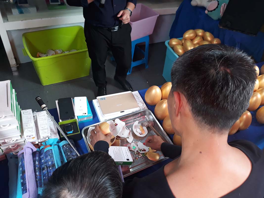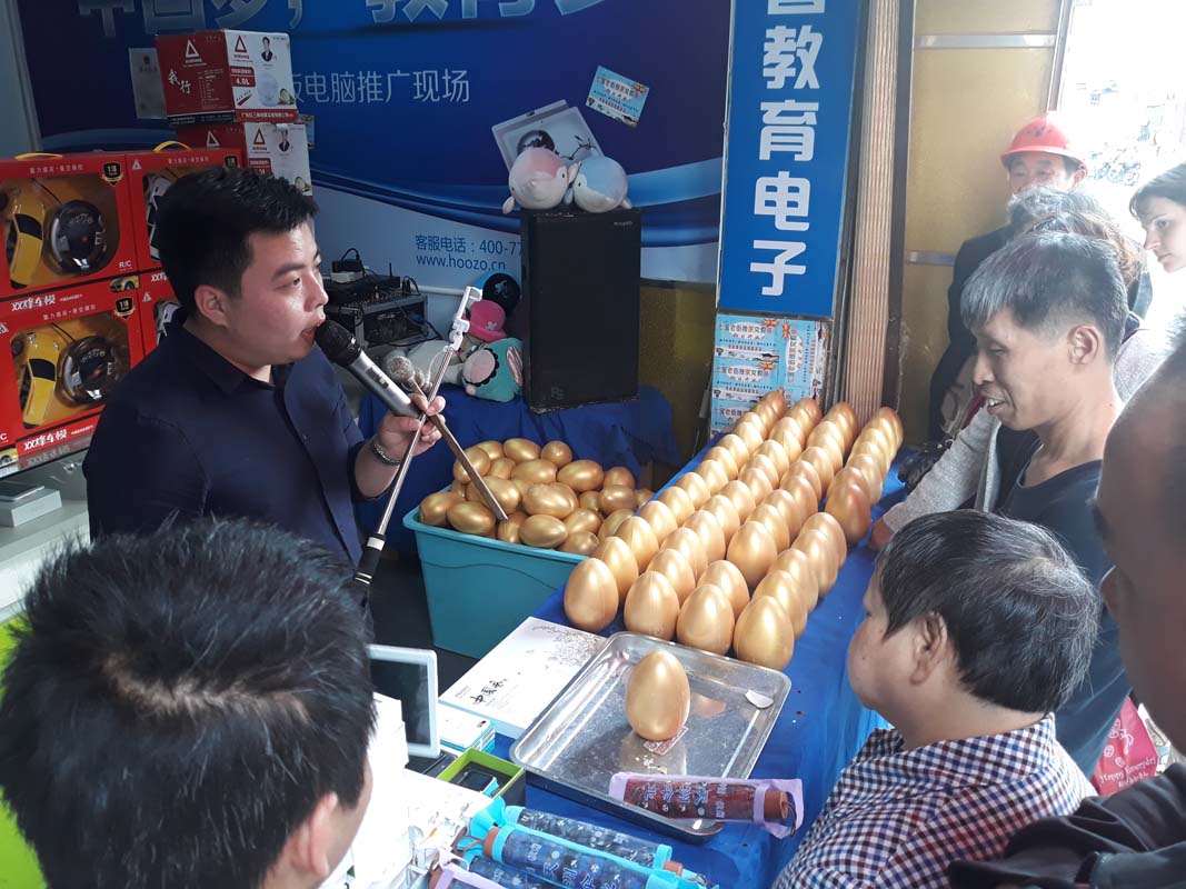Спочатку розводила щось довго розповідає у мікрофон потенційному учаснику. Потім учасник обирає яєчко, та не просте, а золоте! Платить гроші. Бере молоток. І бац… Виграв приз на 5 юанів (0,8$). Знову довга лекція від диктора. Друге яйце! Бац. Вже приз за 10 юанів (1,6$). Причому диктор показує спеціальну таблицю прогресу виграшів. Видно, наш товариш не просто виграв 5, а потім 10 юанів.
