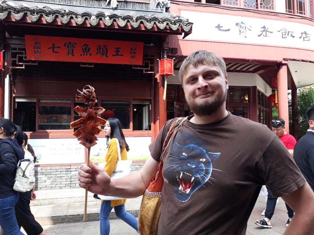 Щодня у нас була якась провальна пам’ятка. Сьогодні на іншому кінці міста на нас чекала дуже старовинна та закрита для відвідування пагода. Але знов-таки для відновлення світової рівноваги ми негайно пішли в ресторан і замовили собі найсмачнішу страву з риби у всьому Китаї.