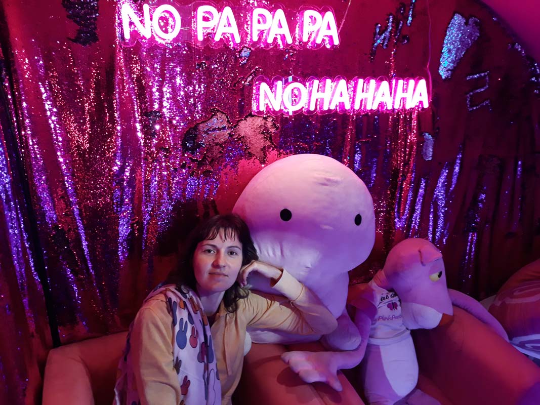 Я летів немов велетень що увірвався до будиночка Барбі. Відвідувачі, як і господиня закладу, дуже напружилися, спостерігаючи мій політ. Я не міг зрозуміти, що відбувається, але летів я, на щастя, чітко на м’який рожевий диван прямо до Патріка зі Спанч Боба. Дівчина нам пояснила, що у цьому будиночку купуєш ігрову картку на автомати та граєш.