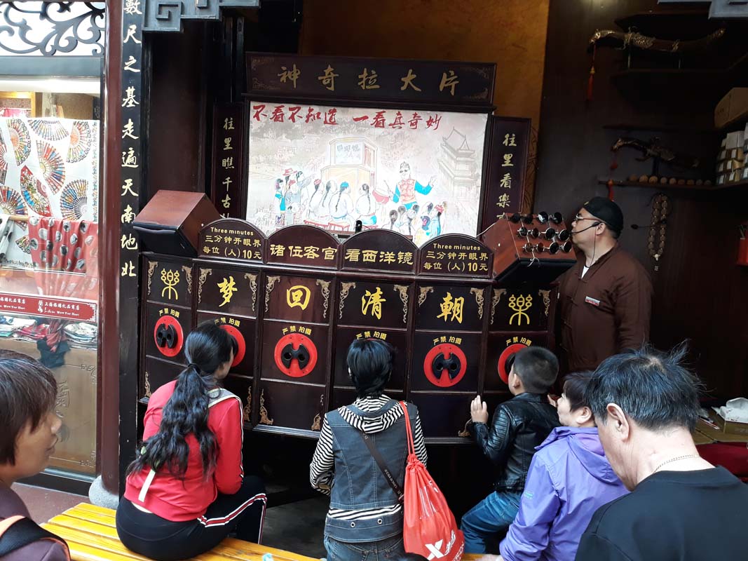 Ми ж вибрали для себе досить нову розвагу. Ми сіли на стільці і заглянули в отвори для очей. Там були зображення із китайських казок на папері. Китаєць у чорних круглих окулярах розповідав дуже захоплюючу казку і смикав за мотузочки. Зображення постійно змінювали одне одного, навіть мали невеликі дива магії, коли на картинках раптово додавалися елементи. Ми китайську розуміли не дуже добре, але було ясно, що казка бомба!