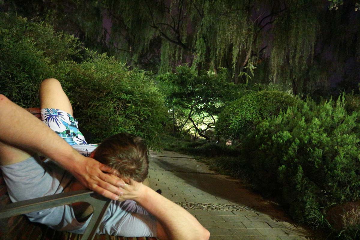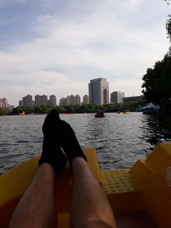 У зеленому парку, що був розташований усередині озера, збиралися музиканти-початківці. Здебільшого трубачі. Схоже, що кожен намагався грати голосніше за сусіда і головне – протилежну за мотивом мелодію. Звучання у парку стояло досить дивне. Але були й відокремлені місця, де мирно спала китайська пара. Після розслаблюючої сієсти потрібно смачно поїсти. А що, у нас сієста зайняла напевно пів дня) Знаю, трохи не схоже на наш темп, але тут не так багато місць, які треба подивитися.