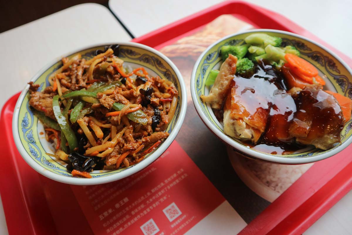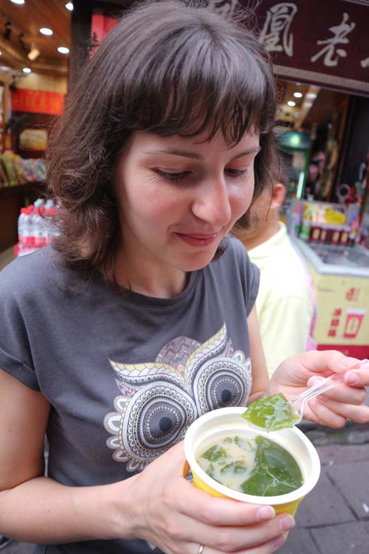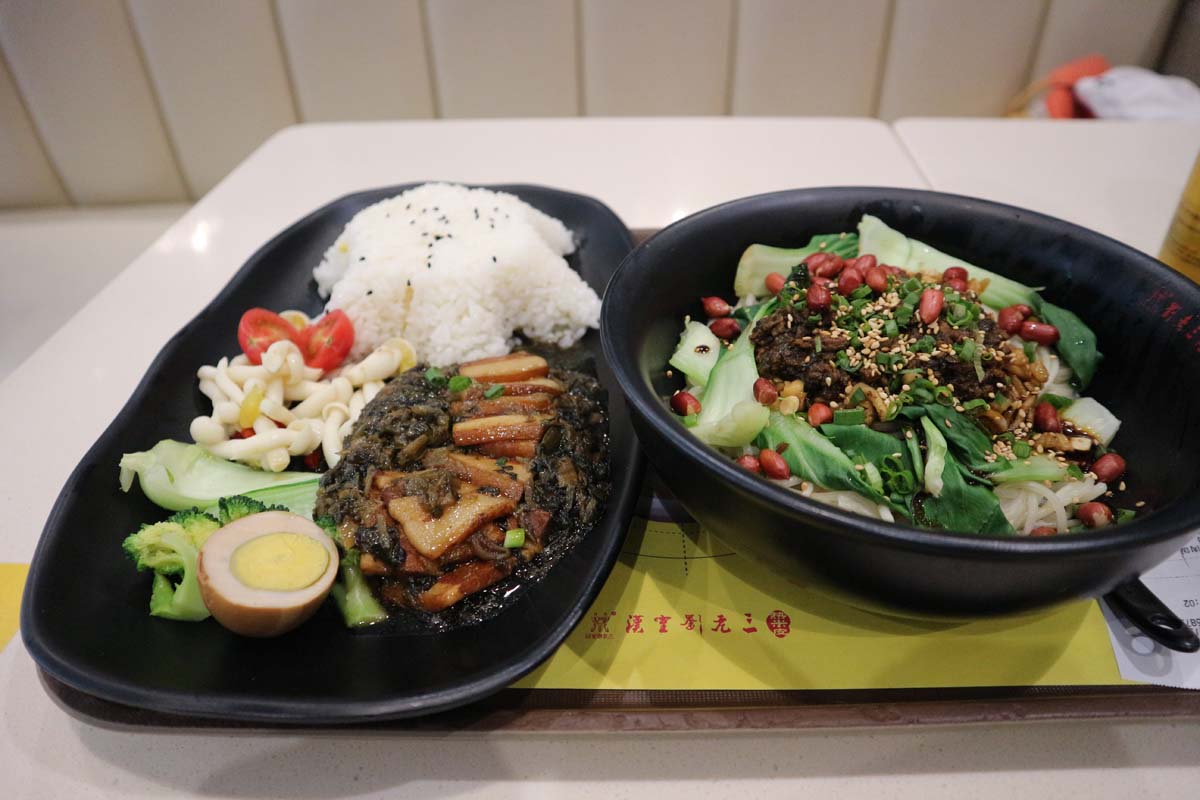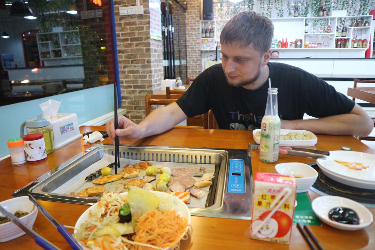 Прямо біля готелю, на нас чекав ресторанчик досить пристойного вигляду. З усієї їжі Азії я завжди уникав саме китайської кухні, чомусь усі спроби куштувати цю кухню в інших країнах були для мене невдалими. Але тепер або сподобається їжа, або її у будь-якому випадку доведеться їсти. Озброївшись багаторазовими громадськими паличками, ми робимо першу пробу. О всесвіт!!! Це чудово! Як стільки приємних смаків може бути у першому ж шматочку? У нас ще нещодавно були проблеми із заселенням у готель, та які взагалі можуть бути проблеми в країні з такою смачною та дешевою їжею. А розміри порцій можуть позмагатися з нашими карпатськими. Як смачно! А раптом це просто вдалий ресторан попався? Аж раптом далі буде не так? Але ж ні, далі було ще краще і краще. Поїсти це завжди було радісно. І навіть сторічні яйця сподобалися! Щоправда, через тиждень на нас чекає вегетаріанське місто, там ми трохи приземлимось на землю від смакових радощів. Але це ще буде не скоро, і ми навіть не підозрюємо про це. О всесвіт! О китайська їжа! О гостро, дуже гостро! ООО! Проте дуже смачно! Різноманітність страв величезна. Як добре, що ми маємо цілих два тижні, щоб тут все перепробувати. Якщо в попередніх поїздках ми відточили майстерність володіння паличками до віртуозності, то в цій поїздці ми були майстрами паличного мистецтва. Абсолютно будь-який тип їжі, навіть смажений арахіс чи слизький рис без проблем. За це ми отримували схвальні погляди від китайців. Я думаю, що дехто залишився розчарованим, адже могло бути таке шоу, якби ми вперше брали палички до рук. У Китаї поїсти це немов перепочинок від нескінченного потоку завдань.