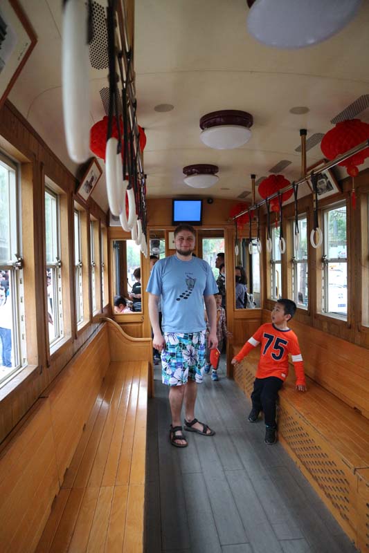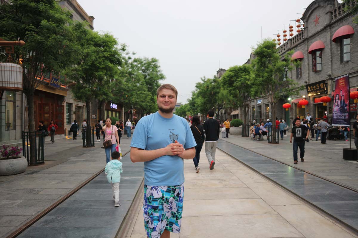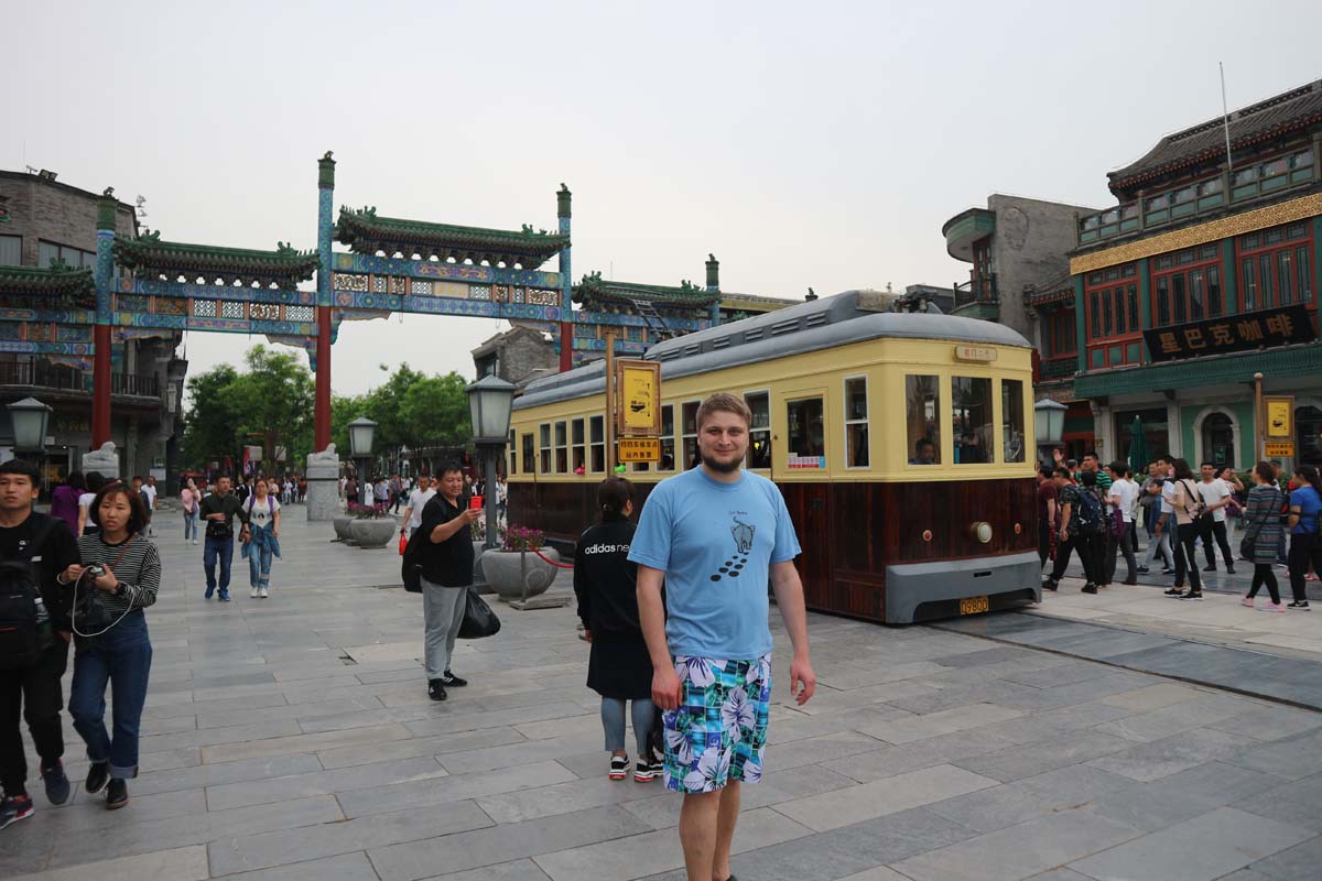 Це на щастя це була потрібна вулиця. Дуже важливим орієнтиром для пошуку вулиці є 正阳门箭楼. Ми зійшли з автобуса та попрямували до початку вулиці. На нас там чекав дуже старовинний трамвай, який зараз же вирушав просто пішою вулицею. Кондуктор нас кликав, щоб ми встигли. Ми без роздумів заскочили в ретро трамвай і вирушили у подорож. Однією з головних визначних пам’яток ретро трамвая були ми самі. Перехожі китайці були вдвічі щасливіші бачити трамвай і нас одночасно.