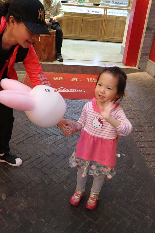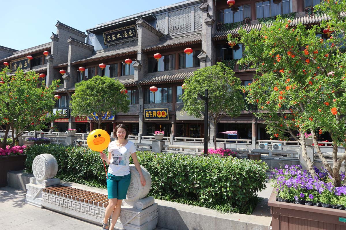 На площі дівчина продавала повітряні кульки саме із такою качечкою. Але розрахуватися можна було лише зчитуванням QR-коду. Фізичні гроші тут безсилі. Дівчина подарувала Даші кулю просто так. Як це радісно, коли люди діляться своїм позитивним настроєм. Такі моменти завжди гріють душу. Сонце, зелені клумби, синє небо та Даша з кулькою – ідилія! Раптом настав час обіду. Що нам на цей раз приготувала стара столиця Китаю? Цього разу на нас чекало спекотне з бекону, водоростей.