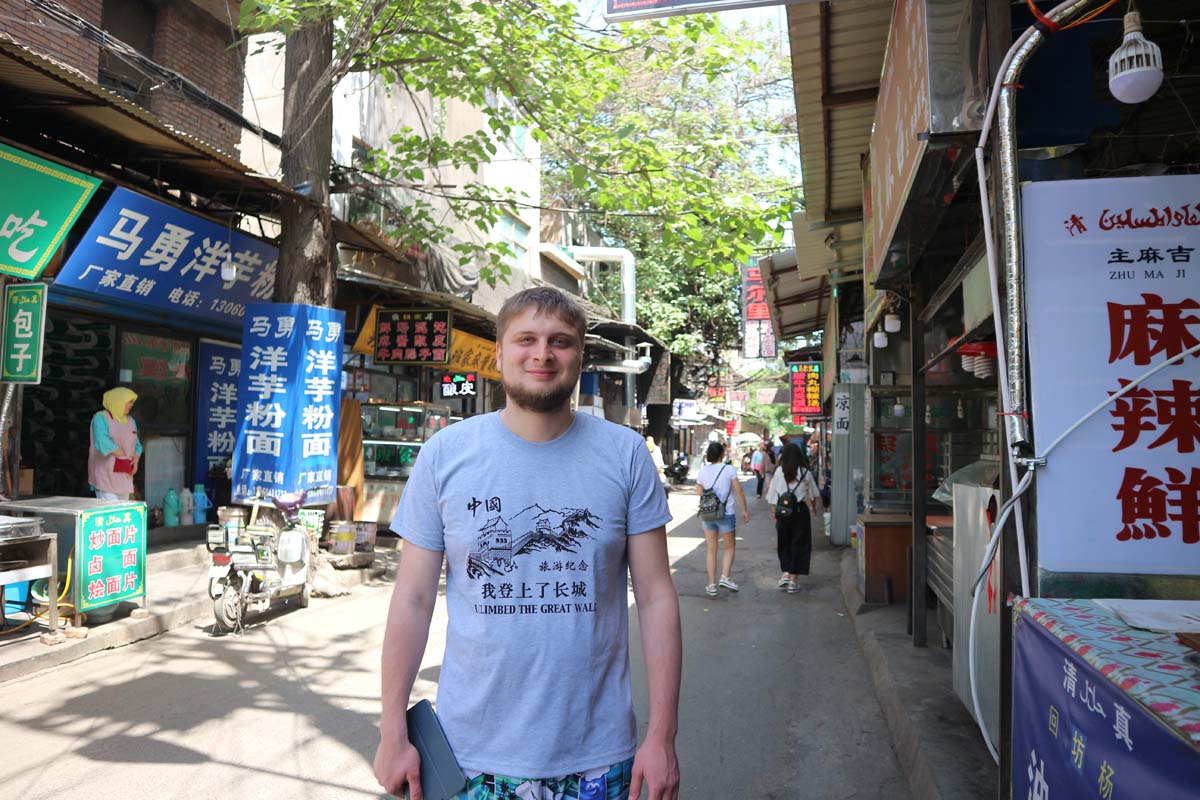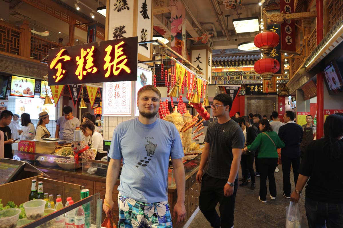 Кінцева зупинка трамвая була на іншому боці пішої вулиці. Тепер давай пройдемо вулицю пішки. Пройти вулицю і вийти з неї до ночі це таке саме складне завдання, як і вселиться в готель Китаю з першого разу. Тут є все і стрітфуд, і магазинчики зі стрітфудом, музеї присвячені самобутності та їжі та багато бронзових статуй. Кожна композиція статуй відбивала фрагмент життя стародавніх китайців. Особливо вдало підкреслювалися фрагменти, пов’язані зі стрітфудом. Крім їжі було безліч магазинчиків і великий критий ринок. В одному із магазинів у мене з’явився дванадцятирічний шанувальник. Хлопчик настільки вразився моїм розміром носа та живота, що хвилин 10 від нас не відходив. Довелося навіть дати йому доторкнутися до носа, щоб він переконався в його справжності.