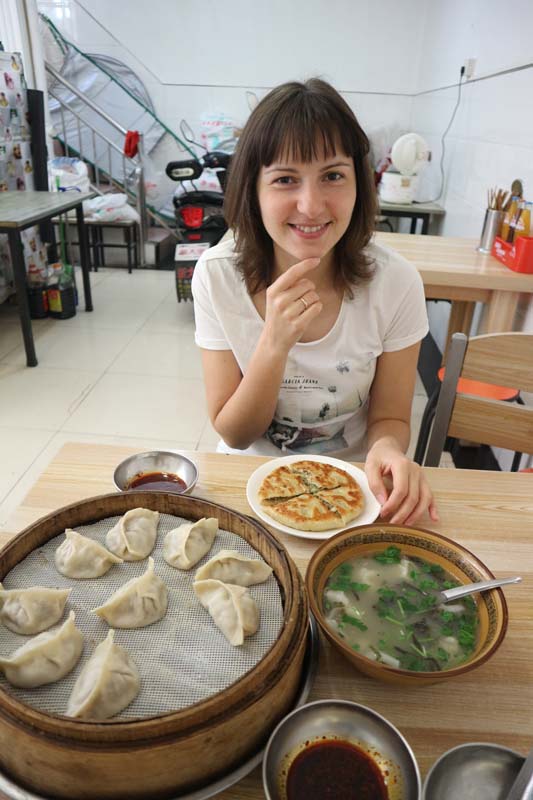Я думаю ми там були одні з перших не китайських відвідувачів. Сіаньські пельмешки найчастіше подаються у вигляді супчику, ще ми взяли величезну порцію вареників на пару та цибулю. Я тішився як дитя. Мене цей сніданок закохав в Сіань. Порції ми ледве подужали. Для більшої впевненості побільше гострого соусу, і ще контрольна капля для дезінфекції. Хазяйка дуже пишалася, що ми вибрали її ресторан. Коли ми прощалися, було зрозуміло, що це наша не остання зустріч.