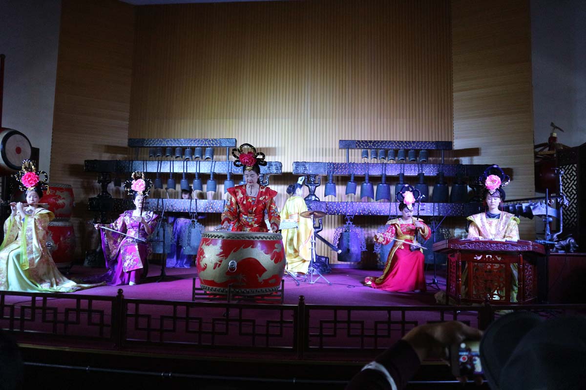 У центрі міста на нас чекали дві вежі – дзвонова та барабанна. У барабанній вежі було безліч барабанів різних розмірів, а ще був і китайський концерт. Спочатку сиділа одна китаянка і грала приблизно одну ноту в секунду. Було трохи дивно, але всі мовчки сиділи й дивились. Між нотами не особливо простежувався зв’язок. За розкладом до концерту ще 15 хвилин, але вони часто повторюються. Цілком можливо, що це попередній. В один момент китаянка пішла і вийшли музикантки, що грають цікаву музику на чудових інструментах.