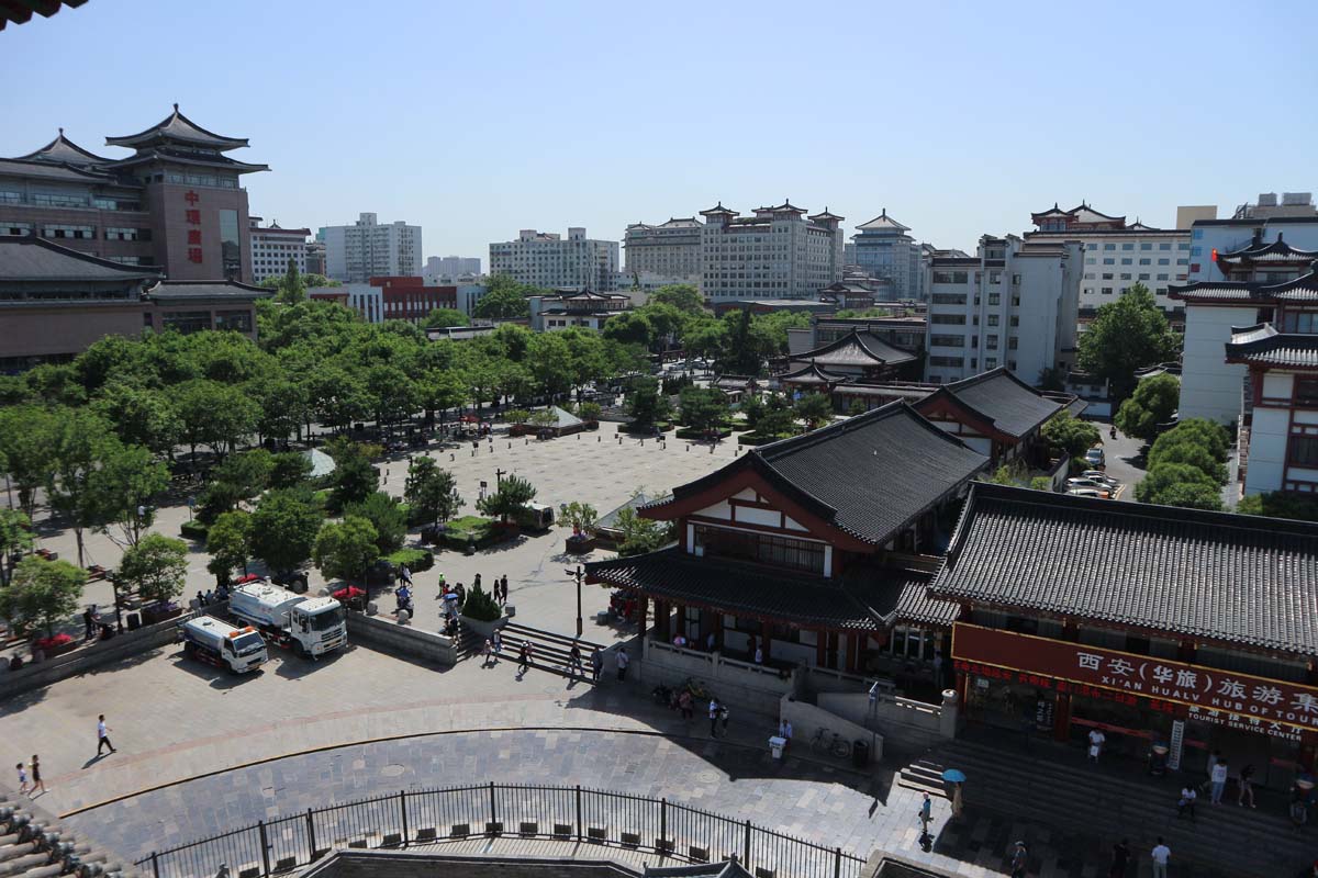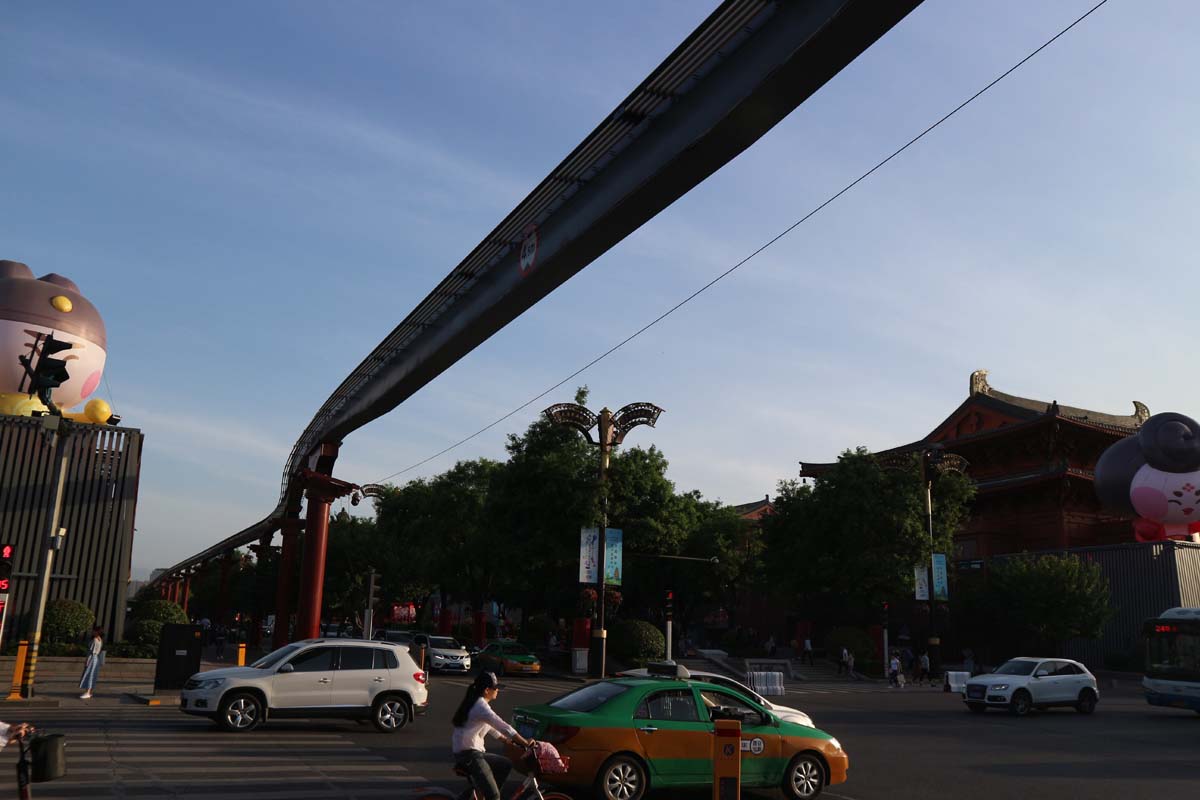 Карти зрадницьки показували нам лише одну гілку метро у місті. Мабуть, хотіли нас ближче познайомити з Сіанем. Біля незрозумілої державної установи стояв великий натовп китайців. Усі з нетерпінням чогось чекали біля відчинених воріт. Причому контингент тут був різний. Ми теж зачекали близько 10 хвилин за компанію, але нічого так і не сталося. Подібне ми ще раз бачили в іншому місті. Схоже, що це батьки чекають на своїх дітей за територією школи. Пагода знаходиться на території храмового комплексу. Гуляння по комплексу та самій пагоді асоціюється з умиротворенням. Навіть не дивлячись на багатоповерхові гвинтові сходи всередині пагоди. Ще було близько 17:00 і теплі промінчики світили, ласкаво пестили тіло. За пагодою починалося дуже незвичайне місто. Усі вулиці та парки пронизувала повітряна траса старої монорейки.