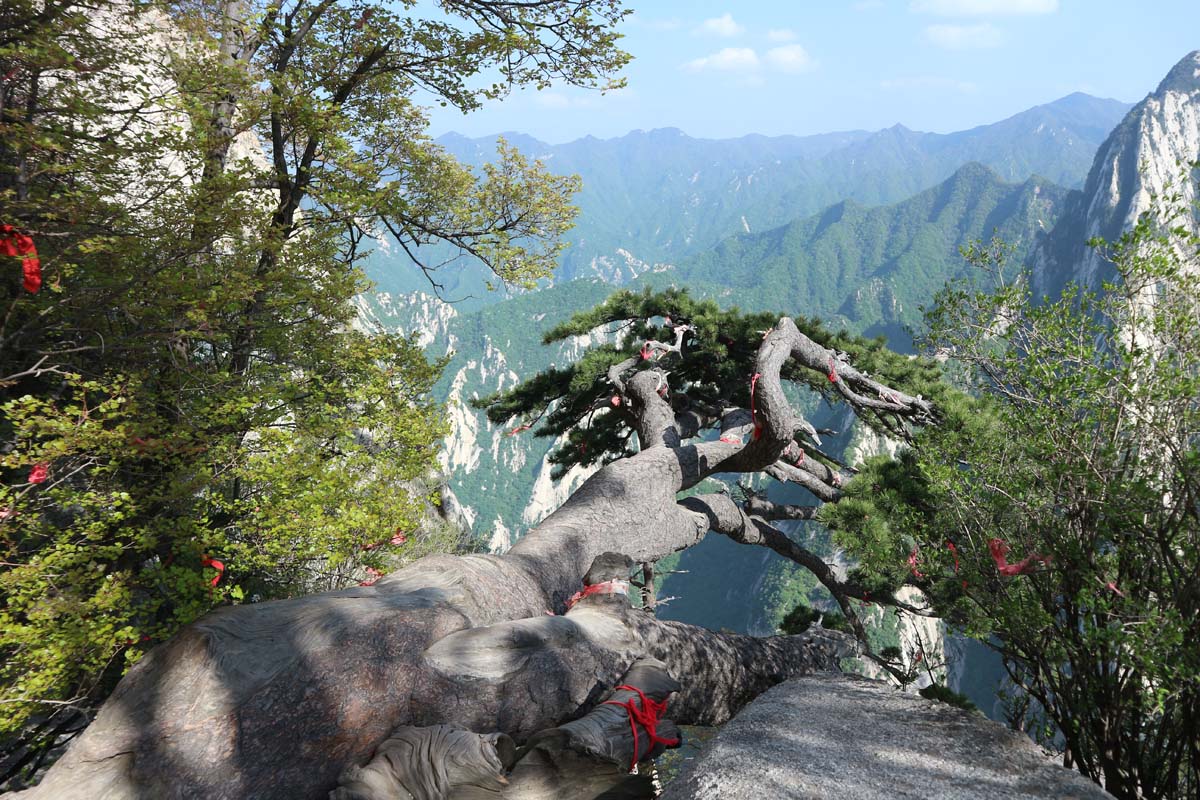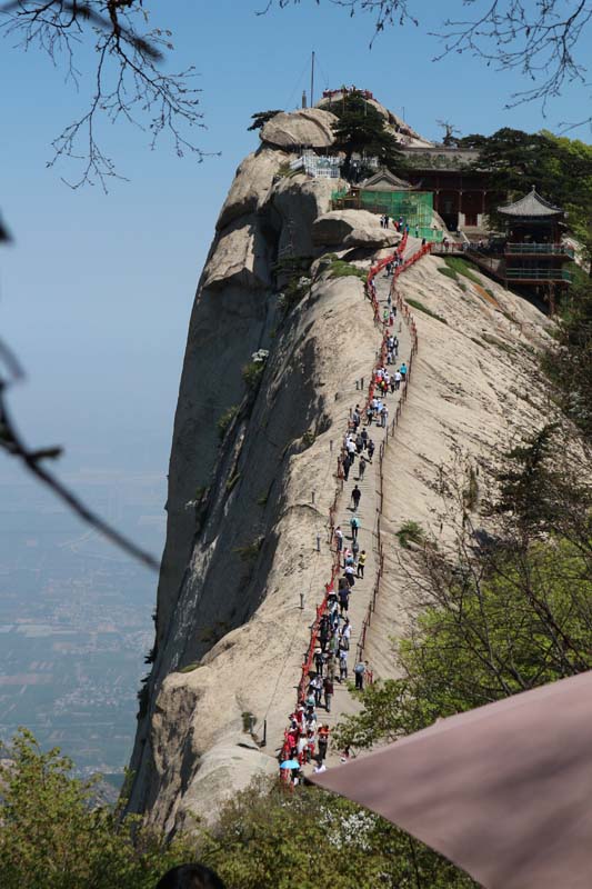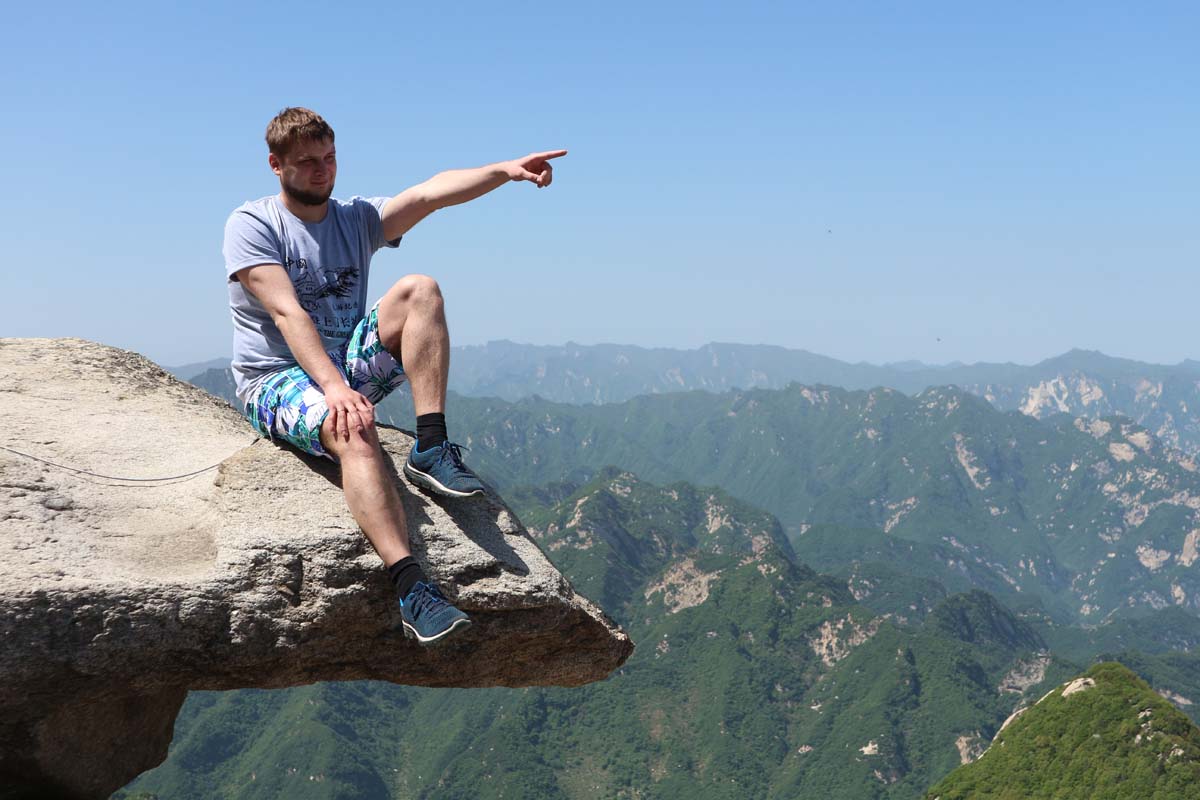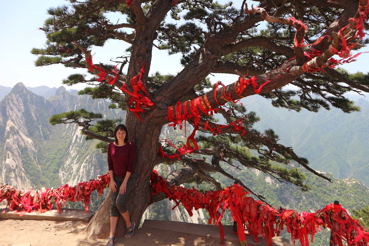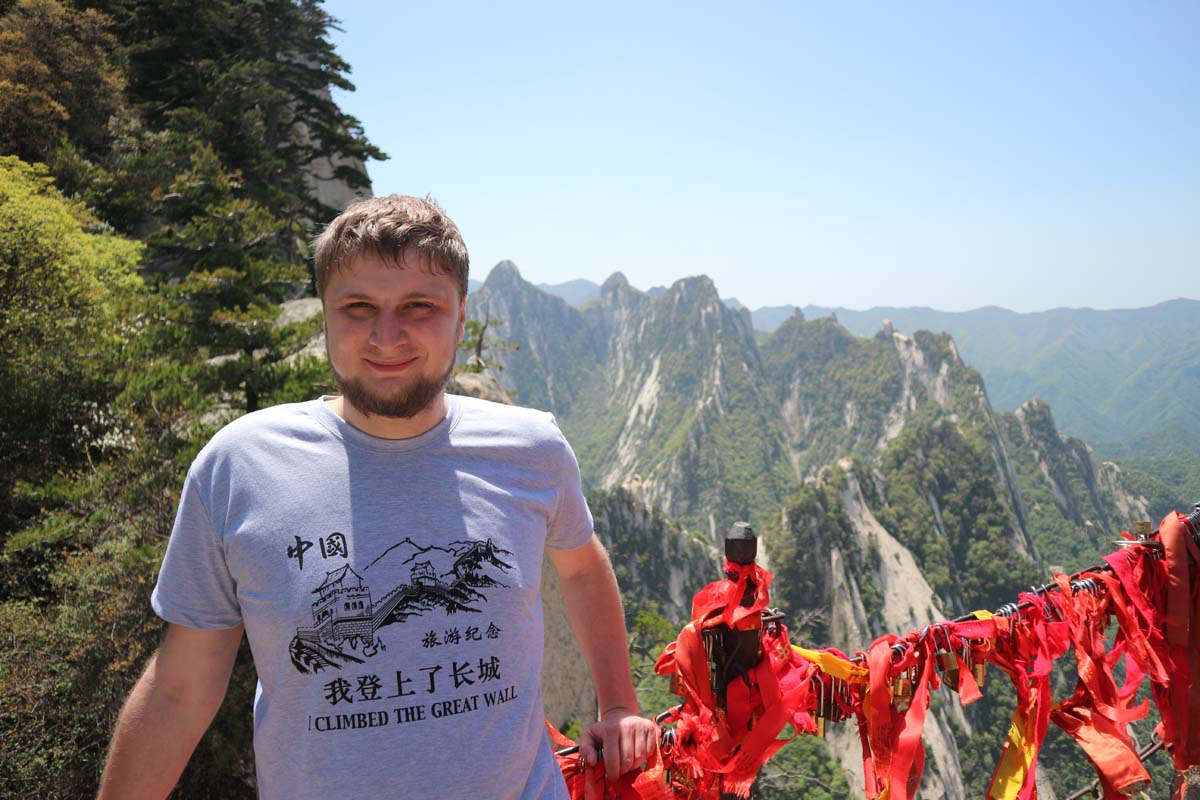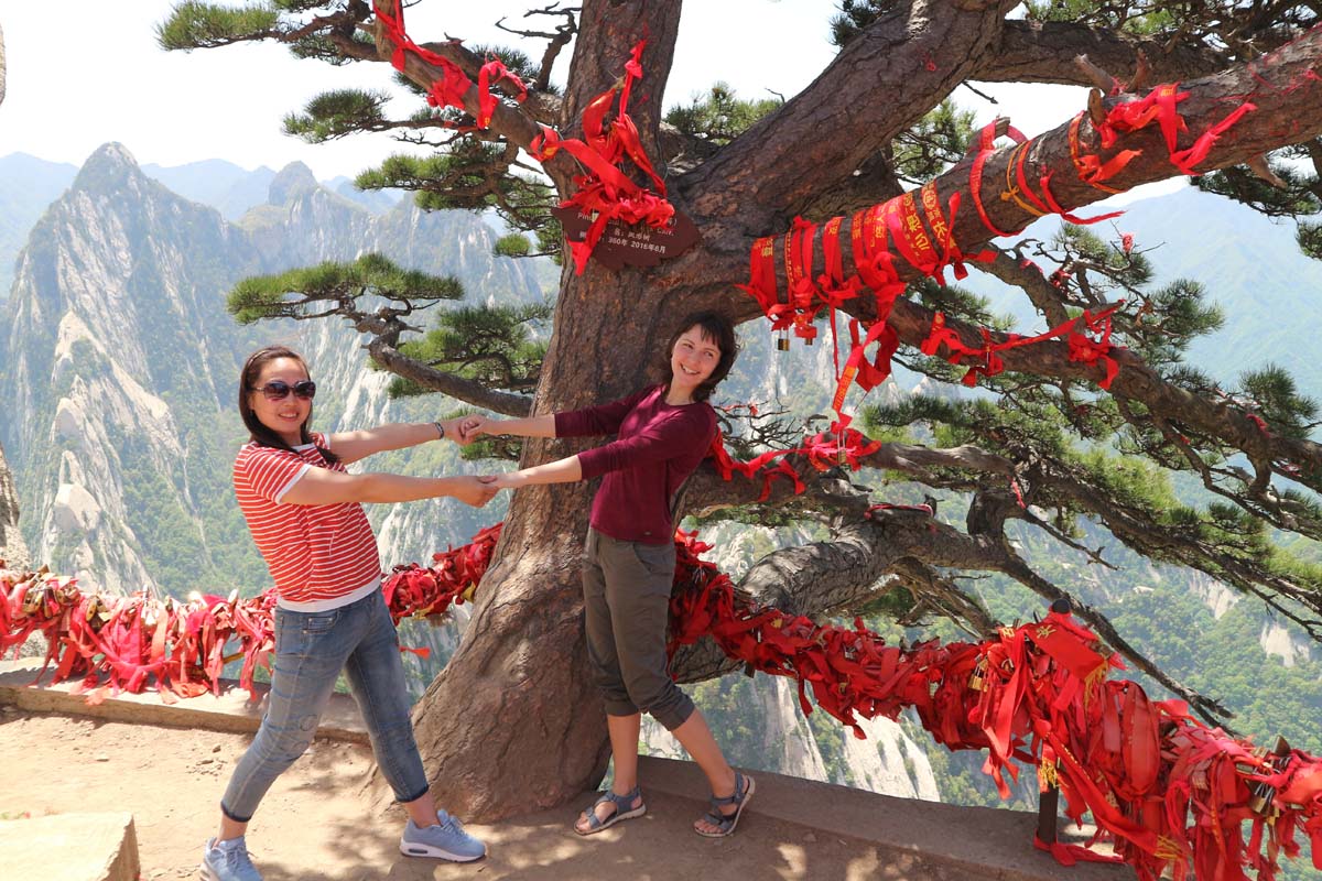 На деревах сотні червоних стрічок-бажань. Стежка на вершину досить крута. Дуже красиво спостерігати з однієї вершини, як люди піднімаються на іншу. Самі підйоми відносно короткі, на щастя канатна дорога вже пройшла основний маршрут за нас. Десь далеко гори закінчуються та починаються рівнинні поля. Поля виглядають так само далеко, як з ілюмінатора літака. У нашій історії подорожей саме гора Хуашань тепер спливає при згадці про Китай. Це тепер для нас візитна картка країни. На шляху нам траплялися валуни з величезними червоними ієрогліфами — скелі для фотосесій.