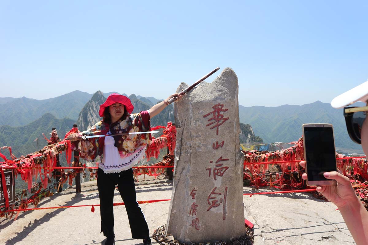 Все-таки треба зробити пару фоточок. Китайці, звичайно, накидають на тебе страховку, але така страховка може врятувати хіба легкого і маленького китайчика, ніяк не бравого іноземця. Ми з Дашею також були відомими експонатами в горах. Кількість фотосесій з нами била рекорди. Одна із фотосесій була досить професійного рівня. Китаянка показувала Даші, в яких саме позах треба стояти. А інша китаянка, побачивши мене, відклала меч і покликала на фотографії. Скелі з ієрогліфами являли собою руни, цікаво, що ж там було написано, що навіть з мечем на їхньому тлі фотографувалися.