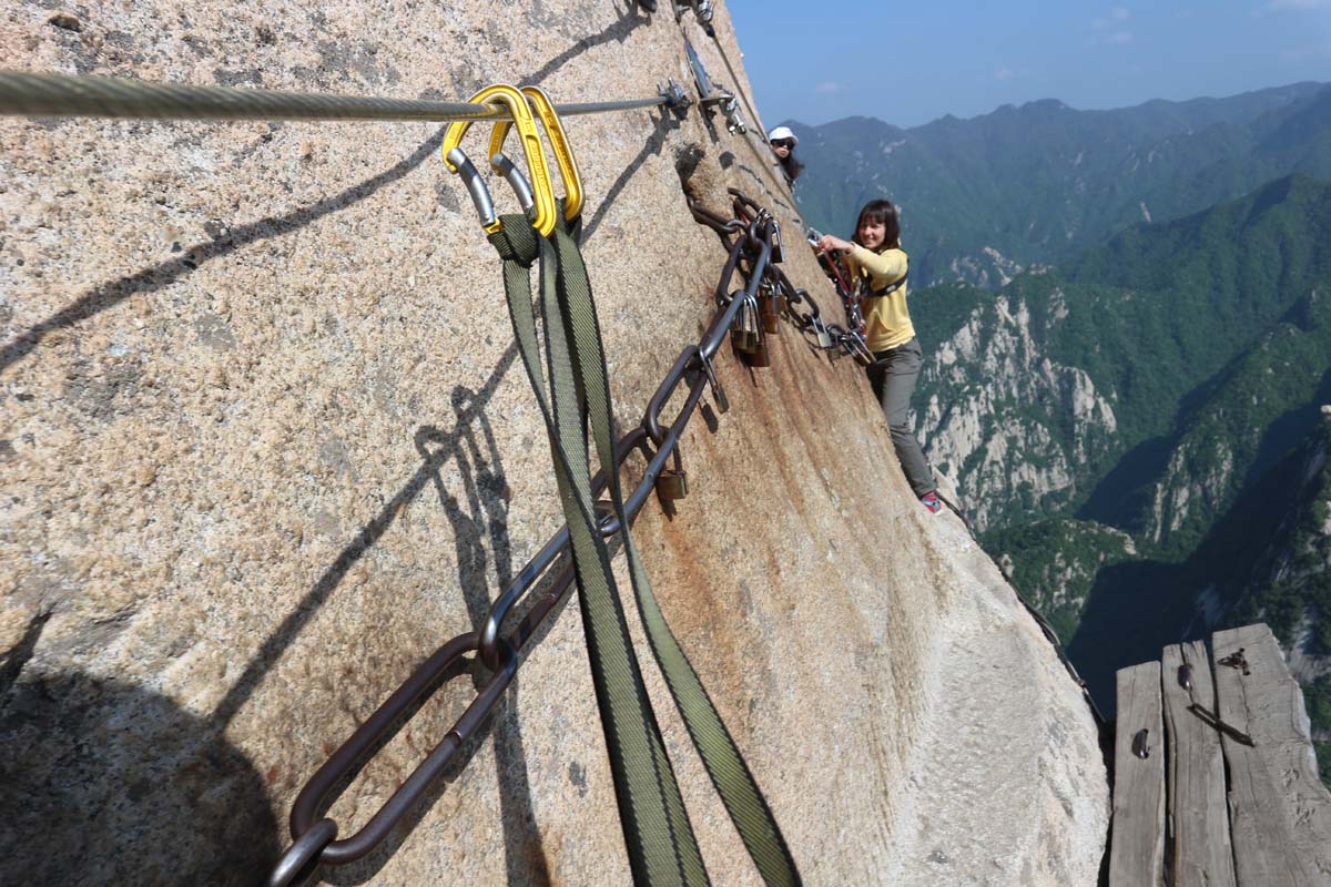 Сходинки розташовані дуже круто. Ноги по них прослизають. Далі йдемо по заглибленню в горі. Щоправда, заглиблення розраховано на китайську ногу. Мої п’яти трохи звисали над урвищем. Але в пальцях ніг зосередилося усе тіло. Головне не забувати кожні кілька метрів відчеплювати та перечіпляти карабіни. Одного разу забув, мене як смикнуло вбік, що мало зірки з очей не посипались донизу куди простягаються кілометри висоти із плоского урвища. Незабаром вглиблення в горі змінилися дощечками. Вже ніби з горою зріднився, навіщо на дощечки міняти, і так пальцями ніг непогано тримаюся. Страшним моментом був перехід на першу дошку. Хоча що означає страшно? Тут вся дорога суцільний страшний момент. Організм ніби блокував усі думки та непотрібні інстинкти.