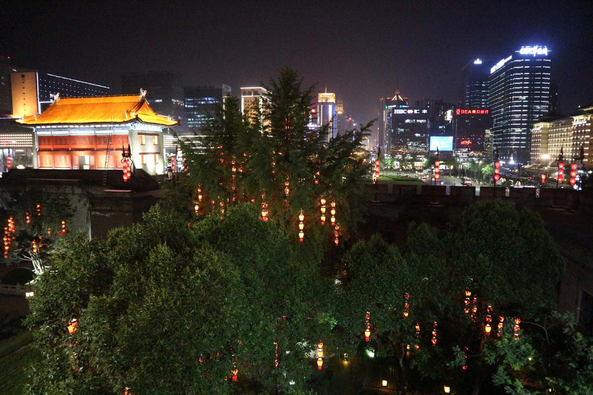 За стіною розпочинається сучасний бізнес-центр Сіаню. Висотки, що світяться, наче велетні, яких не пропускає стіна в старе місто. Мені хотілося сісти біля обриву стіни і почати писати про нашу подорож прямо тут. Але ми не мали ні ноута, ні часу. Усередині нас переповнювало безліч позитивних емоцій. В голові у мене вже звучали ідеї-заготовки для цієї розповіді. Їх достатньо було б зібрати просто в купу і розповідь про Сіань готова.