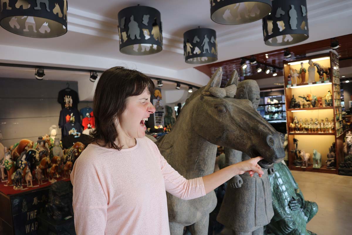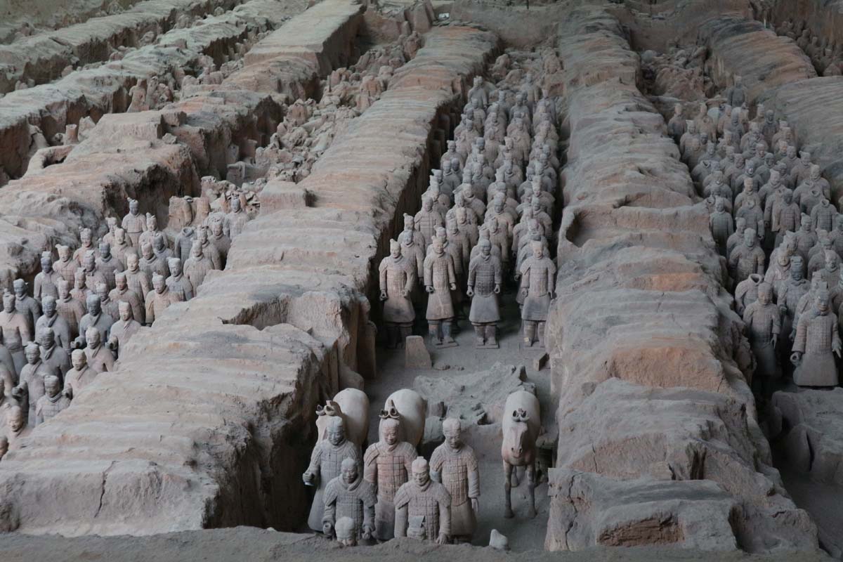 Ця визначна пам’ятка мені добре відома з дитинства. Я знав одне, що армія десь дуже далеко. Але ми вже їдемо до неї в автобусі. Насправді це ще велике щастя, що ми їдемо в автобусі. Навігатор ще раз відзначився і повів нас через нетрі, перш ніж завести в автобус. Їхати було хвилин 40 у сусіднє місто. Усі вийшли, і ми вийшли. Автобус поїхав. Хвилин через 20 ми з’ясували, що вийшли зовсім не там. Весь натовп вийшов, щоб підніматися канаткою до храму, куди нам не треба було. Знову їдемо автобусом. Імператор сховав свою армію настільки добре, що навіть за наявності карти та купи китайців, у нас пішло близько години, щоб знайти вхід. Вхід на територію був десь поруч. Автобуси привозили юрби китайських туристів. Але навіть за рухом натовпу ми вибрали неправильний шлях. Зате вдосталь набродилися туристичною вуличкою. Тут явно всі чекали на туристів. Таке скупчення дорогих ресторанів та лотків ми ще не бачили. Складалося відчуття, ніби всі визначні пам’ятки були непопулярні. Усі їхали саме на теракотову армію.