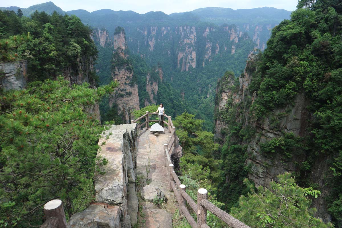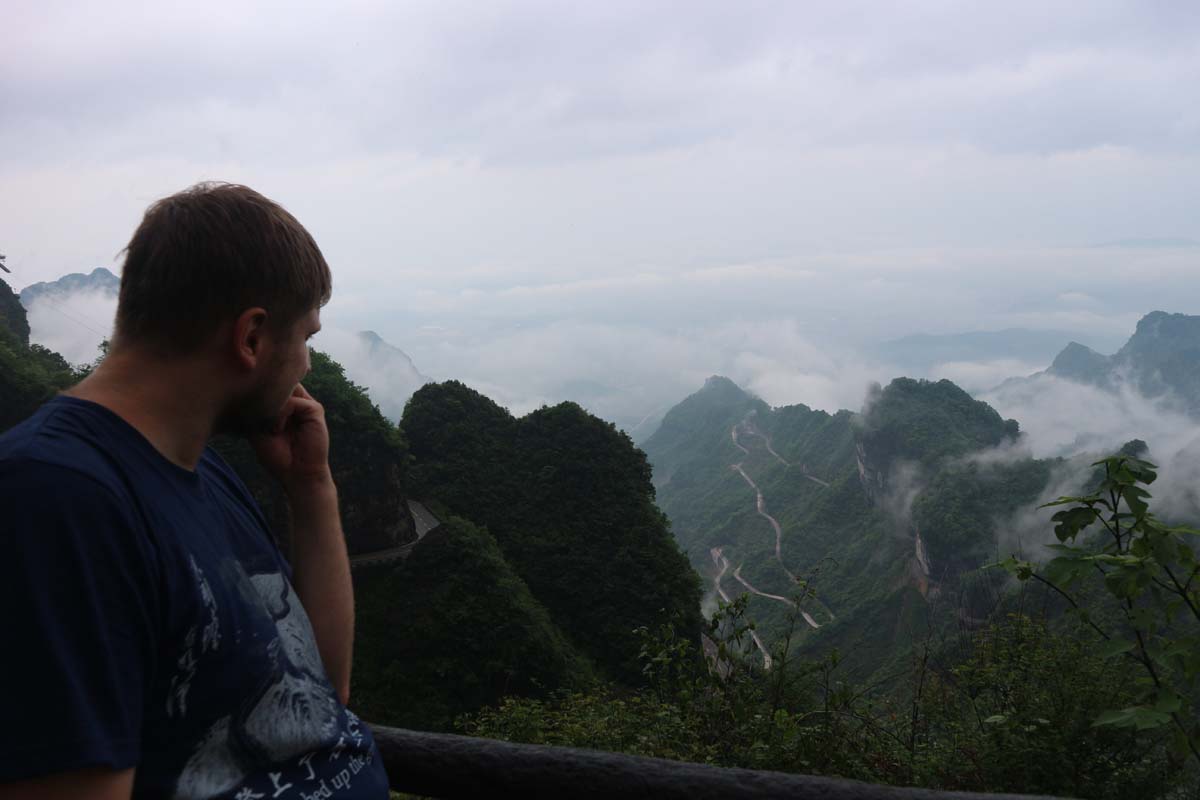 На цей випадок є телефон автобусної служби, якій можна зателефонувати з китайського телефону. Варіант відпадав. Уся логіка показувала, що робити цього не варто, можна не встигнути вибратися. До того ж карта теж може дати похибку і завести не туди. Та й на маршруті ми вже близько дев’ятої години. Але, з іншого боку, ми собі значно спростимо завтрашній маршрут, тож уперед! Добре, що нас ранкова мавпа навчила бігати горами. Ми рухалися не так швидко, як вимагав GPS трекер на картах, щоб вкластися в прогнозований час. Але ми знали, що буде одна з найкращих панорам, про це писав один блогер. По дорозі нам зустрічалися працівники, що закривали магазинчики та рухалися у зворотньому напрямку. Коли ми дісталися то ми зрозуміли, заради чого ми так старалися. Це був незвичайний оглядовий майданчик на гори-стовпчики.