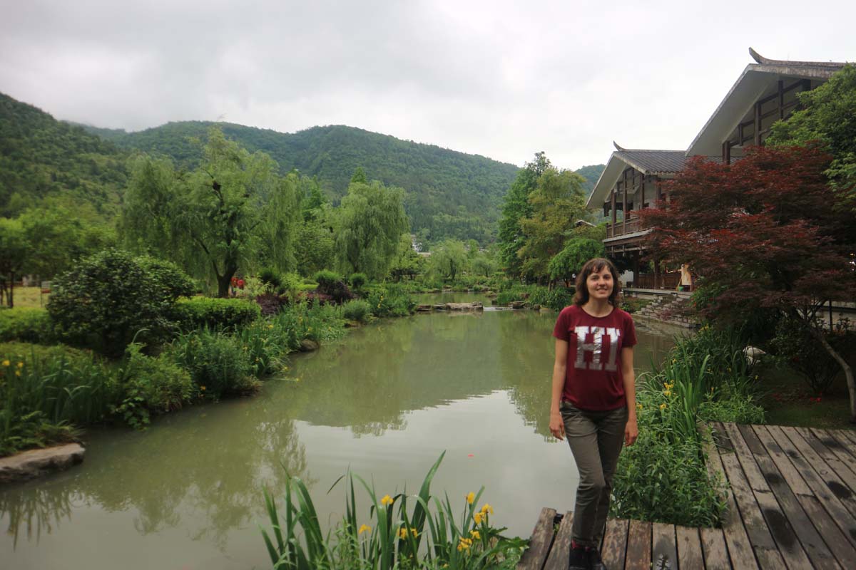 Якщо хочеться потрапити до парку без китайців – просто прокиньтеся дуже рано і прийдіть до зупинки у будній день, за 20 хвилин до відкриття. Ми вирішили ночувати дві ночі в Улін’юані. На цей раз пропустимо церемонію пошуку готелю з унітазом. Перейдемо до приємної частини – ми заселилися у справді гарний арт-готель. На вході до якого відпочивав величезний звір, що віддалено нагадував собаку.