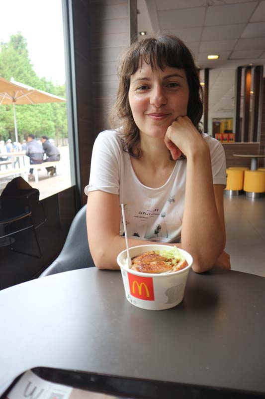 Як він узагалі сюди дістався? Серед сотень лотків зі стрітфудом пробрався єдиний ресторан Макдональдс. Щоправда, туалет у ньому не працював, води в умивальнику не було. Ми в Китаї вже знаходилися тривалий час, і перезавантаження від китайської їжі було у самий раз. Це був найсмачніший даблчізбургер та лате. Даша не відступала від китайських смаколиків і замовила собі в маку рис з м’ясом 😊.
