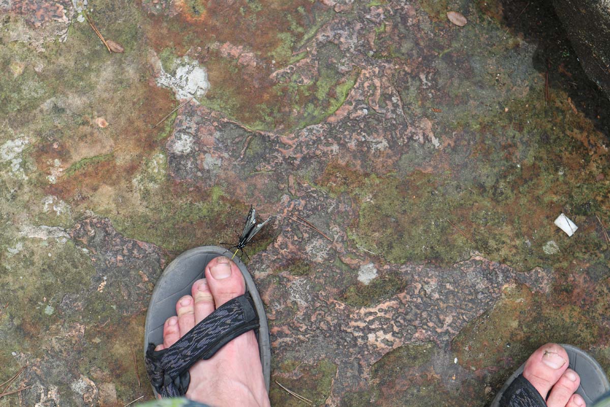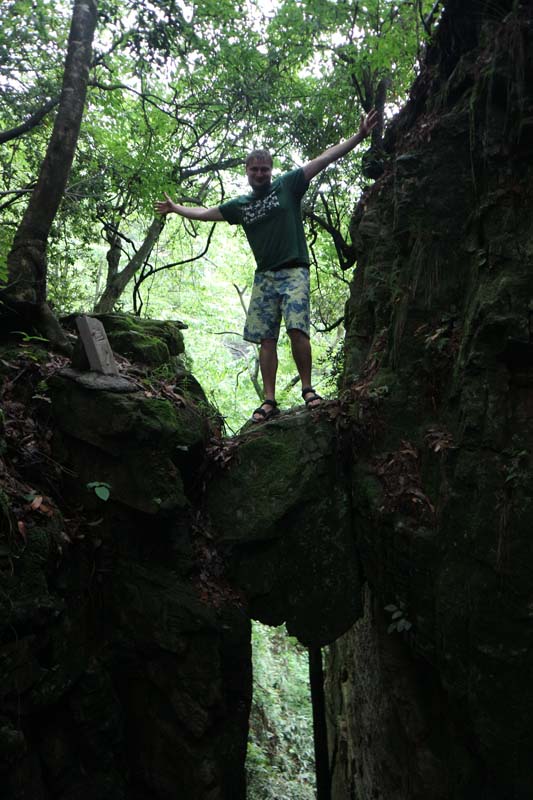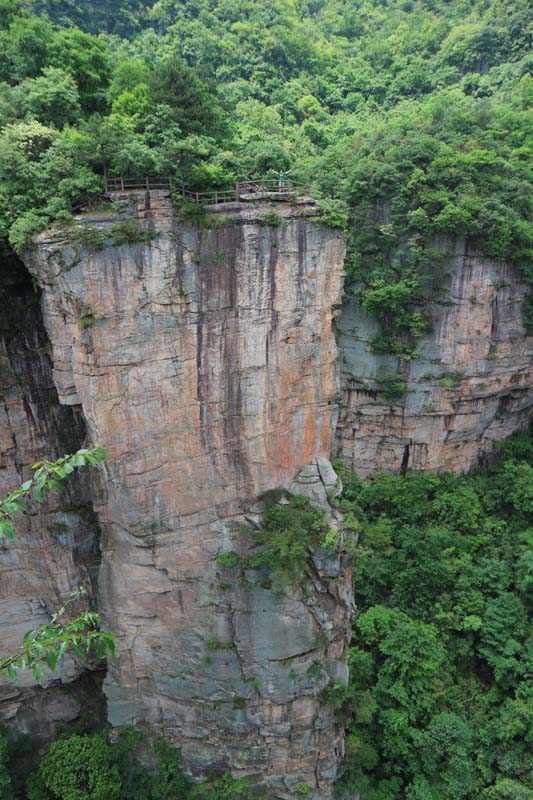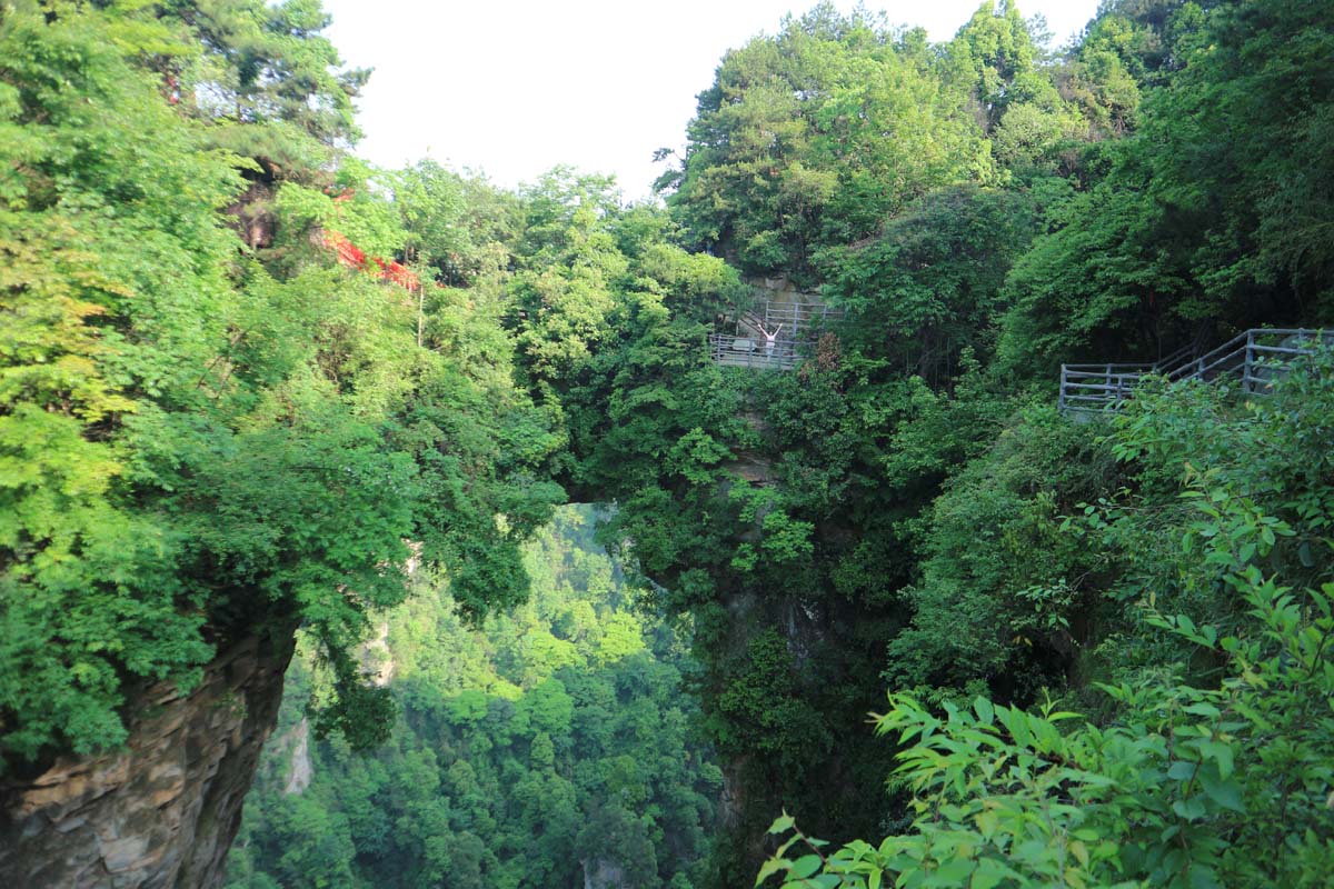 Китайців було багато. Ну, мабуть, це мало, але для нас багато. Але приємний момент – всі китайці ходять лише групами і лише за доступними панорамними оглядами. Якщо сісти на маршрутку і зійти на проміжній станції, можна знайти найгарніші панорами взагалі без людей. І, на щастя, без мавп. Один з оглядів навіть був на вершині стовпчикової скелі. Ця скеля відділялася лише на кілька метрів від материка. Перехід зроблений із металевих ґрат. Подивившись вниз, можна побачити гігантську тріщину. Поки ми милувалися красою, до ноги підсів гарний метелик. Метелик йшов все ближче і ближче до мого великого пальця ноги.