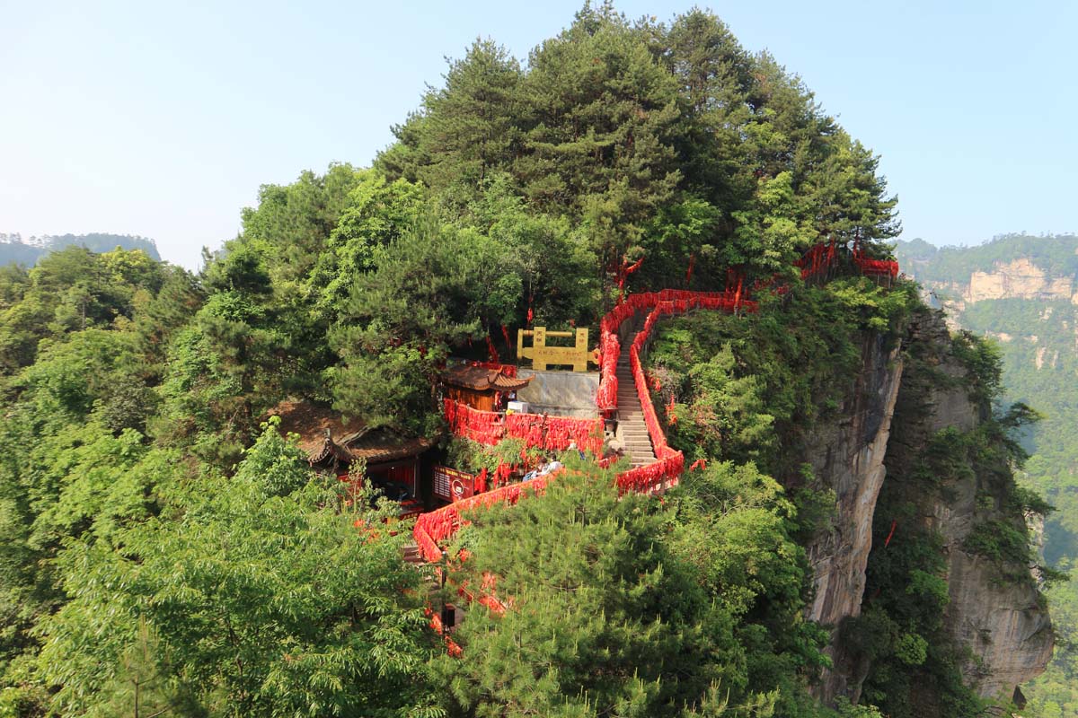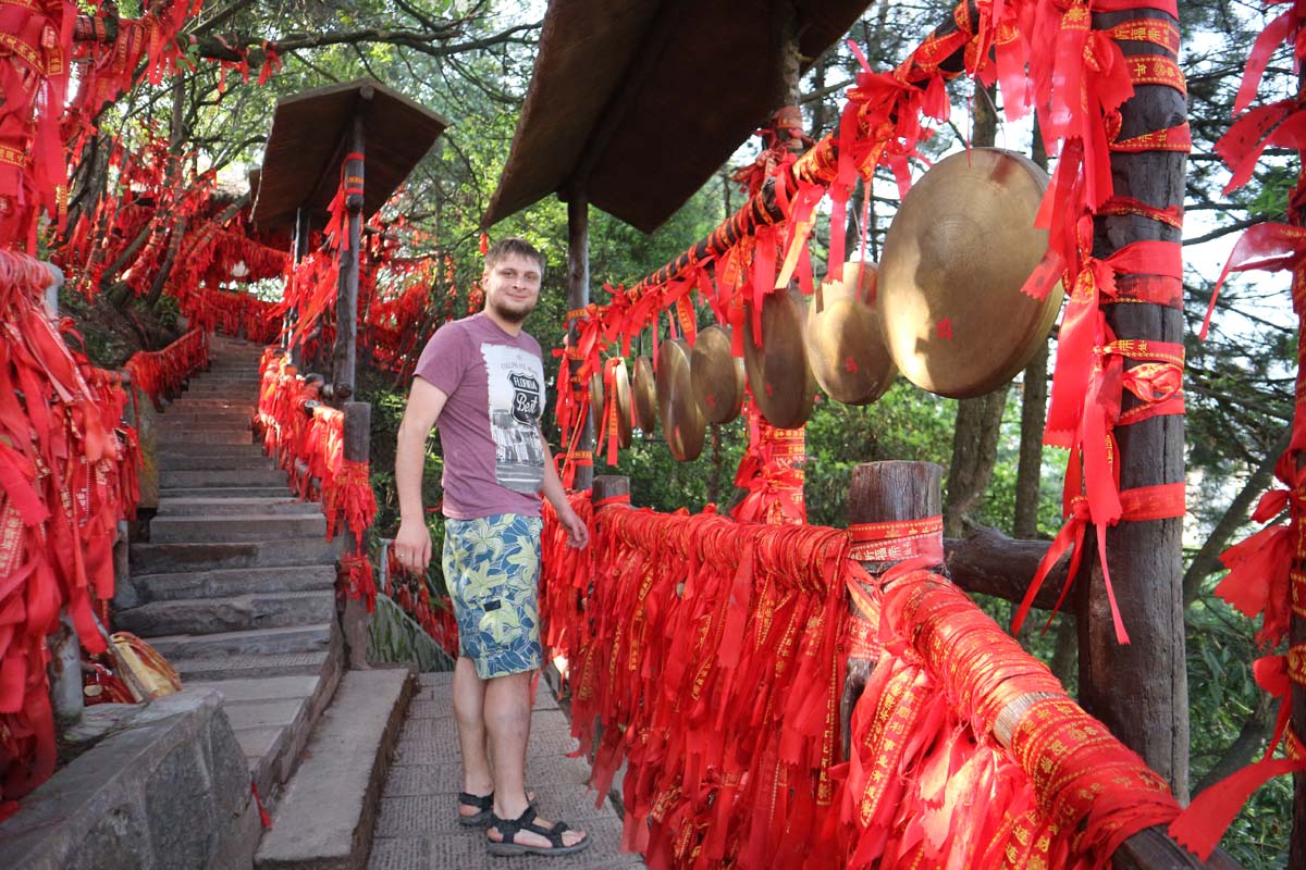 Під мостом прірва, і десь далеко внизу стирчать верхівки дерев. Радісно! Гарно! Ось тільки фотоапарат, починаючи з Фенхуана, дає невеликі збої. Тримайся фотик, всім нам тут важко) Китайські гірські храми з червоними стрічками — це виглядає дуже чарівно.