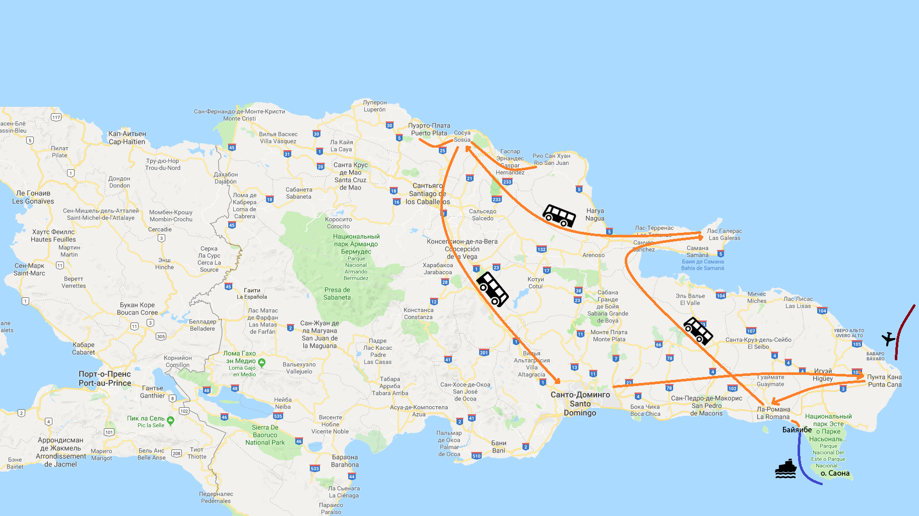 У Домінікані з транспортом все дуже легко та просто. Перебуваючи в будь-якій точці Домінікани, можна підійти до першої ж маршрутки і назвати місто, в яке вам треба. Вам або скажуть з якої маршрутки потрібно починати, а далі передаватимуть між маршрутками та автобусами з рук в руки доти, доки мандрівник не опиниться в потрібному місті. Багато автобусів чекають один на одного, тому пересадки проходять дуже легко.