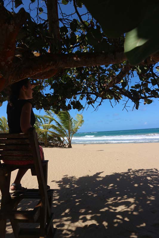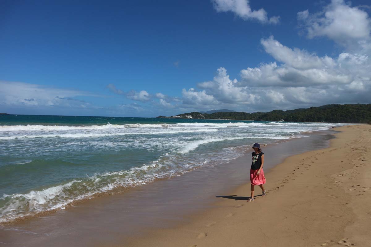 Починаємо наш маршрут, хвилин за 30 дісталися до траси і не встигнувши моргнути, нас уже віз бусик до Домінікуса. Але оскільки ми були єдині пасажири, а бусик, мабуть, належав якомусь готелю, то водій з радістю відвіз нас прямо до входу в національний парк, що знаходився у далекому пішому кінці Домінікуса. Ми в черговий раз пораділи як швидко і просто тут все вирішується з транспортом. Але так і не придбали із собою у похід воду. На щастя, береговий охоронець п’ятизіркового готелю нам з радістю наповнив пляшку. На сьогодні у нас маршрут нескінченною береговою лінією. З одного боку джунглі, з іншого — безлюдний пляж. Ми це називаємо сафарі. Така традиція саме і з’явилася у цій поїздці.