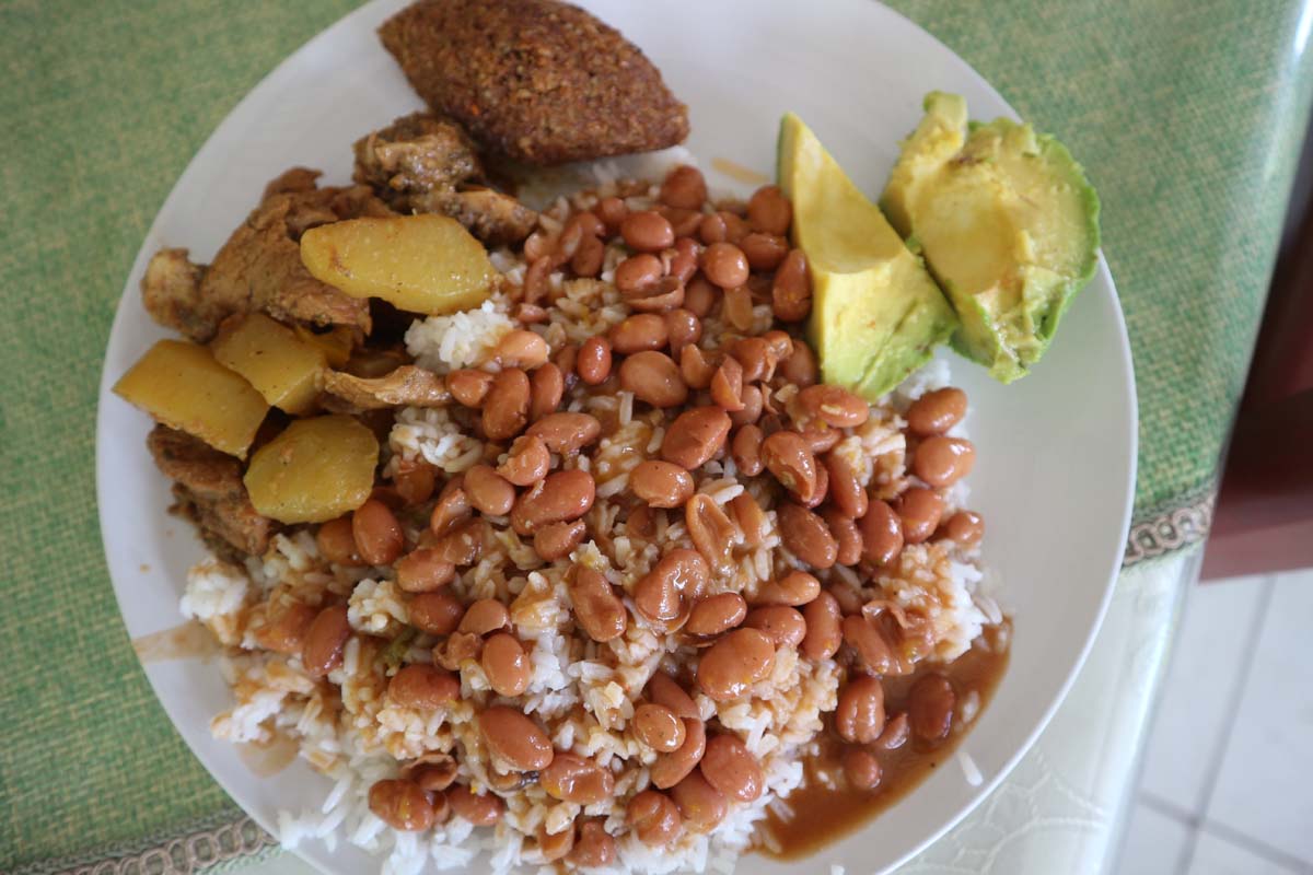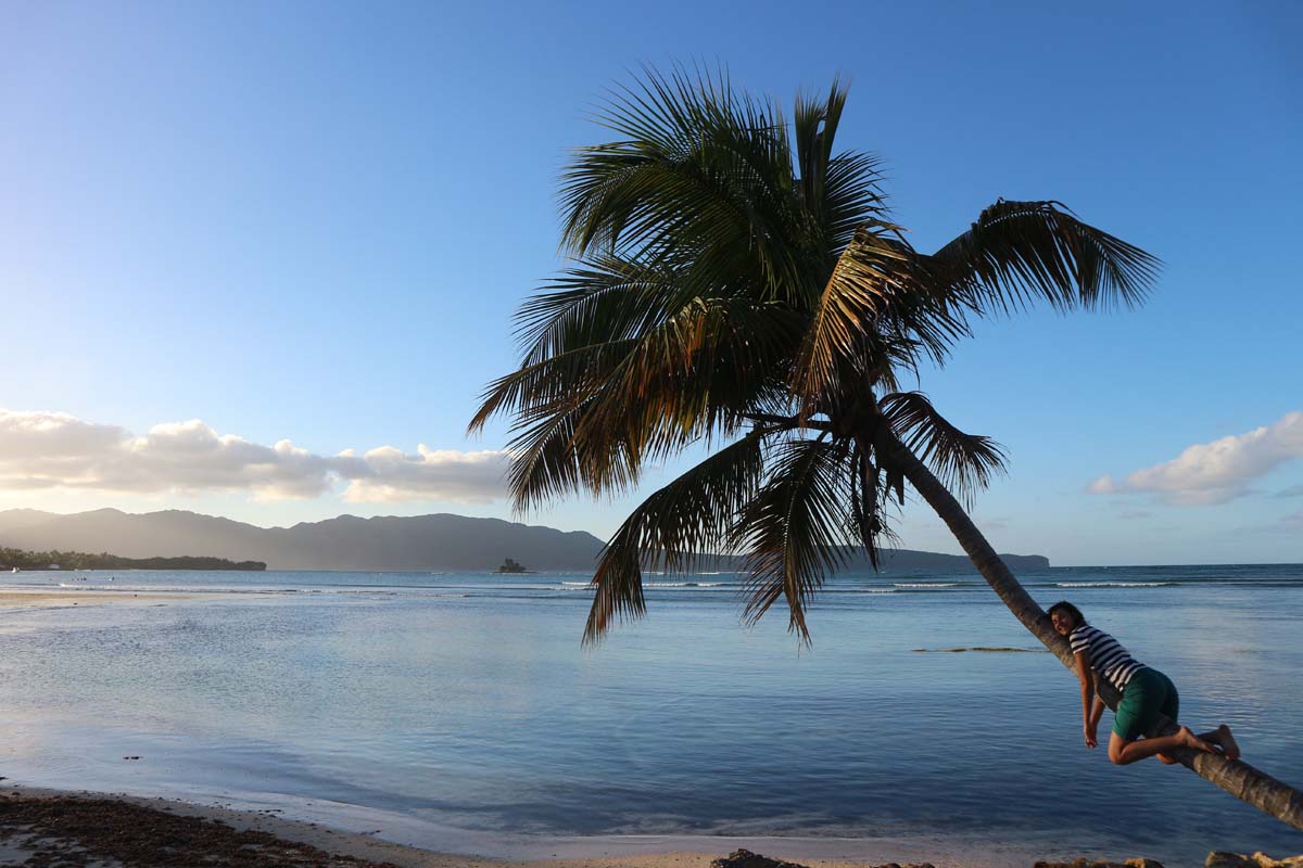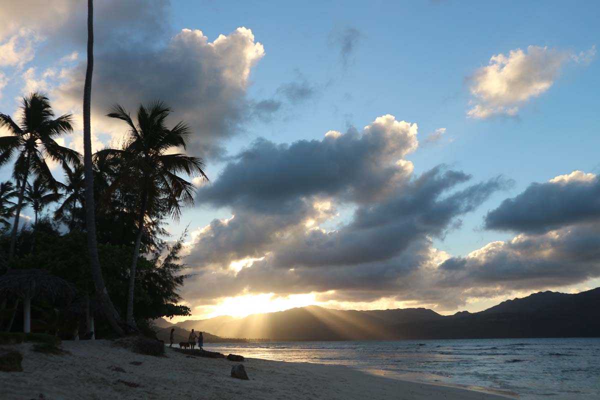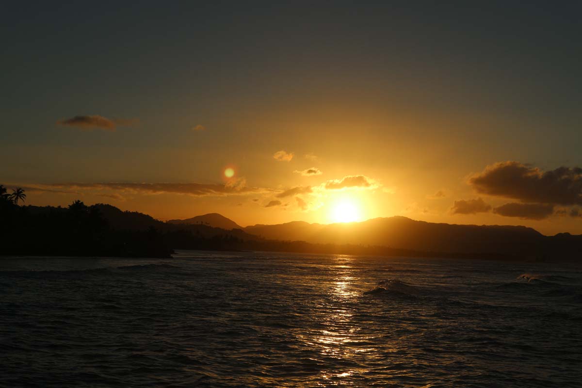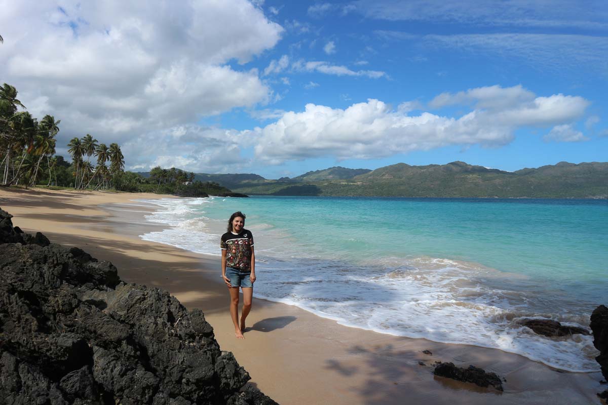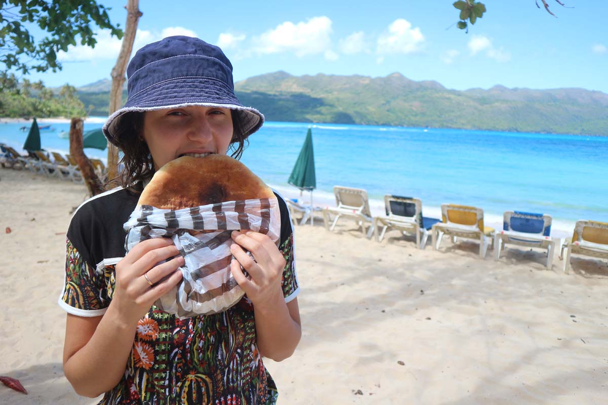 На нас чекав довгий піщаний пляж з гарною водою, але оскільки вже була друга половина дня, то справжню красу води ми зможемо побачити лише завтра. Ми безтурботно бродили, пляжем, затоками з застиглої лави та сільськими провулками. З собою у нас були банани, які ми здобули під час пересадок на маршрутках. На останній пересадці Даша залишилася з речами і до неї підійшов місцевий хлопець і почав розповідати про Домінікану, про Гаїті, як вони тут на одному острові мешкають і подібні цікавості. Я в цей час збігав до банкомату зняв грошей на всю поїздку, прикупив води та гроно найсмачніших кисло-солодких бананів. Банани в Домінікані бажано завжди мати з собою, вони не дадуть пропасти з голоду під час довгих мандрівок по джунглях і безлюдним пляжам. Ми не відзначили пляж у самому селищі як щось особливе, тому що тут є набагато цінніші туристичні місця. Хоча пляж красивий. О 19:00 настає густа темрява, селище в якому на кожному кроці грає гучна музика включає її ще голосніше. Таке враження, що Домініканці ніколи не сплять. Місцеві жителі розпочинають продаж місцевого стрітфуду. В основному це курка в клярі, батат та смажені банани. Якщо пощастило з локацією, асортимент чебуреків до ваших послуг. Все дешево та смачно, велика порція їжі коштує 150 песо (3$), смачний середній чебурек 50 песо (1$). Але чебуреки та батат далеко не у всіх селищах.