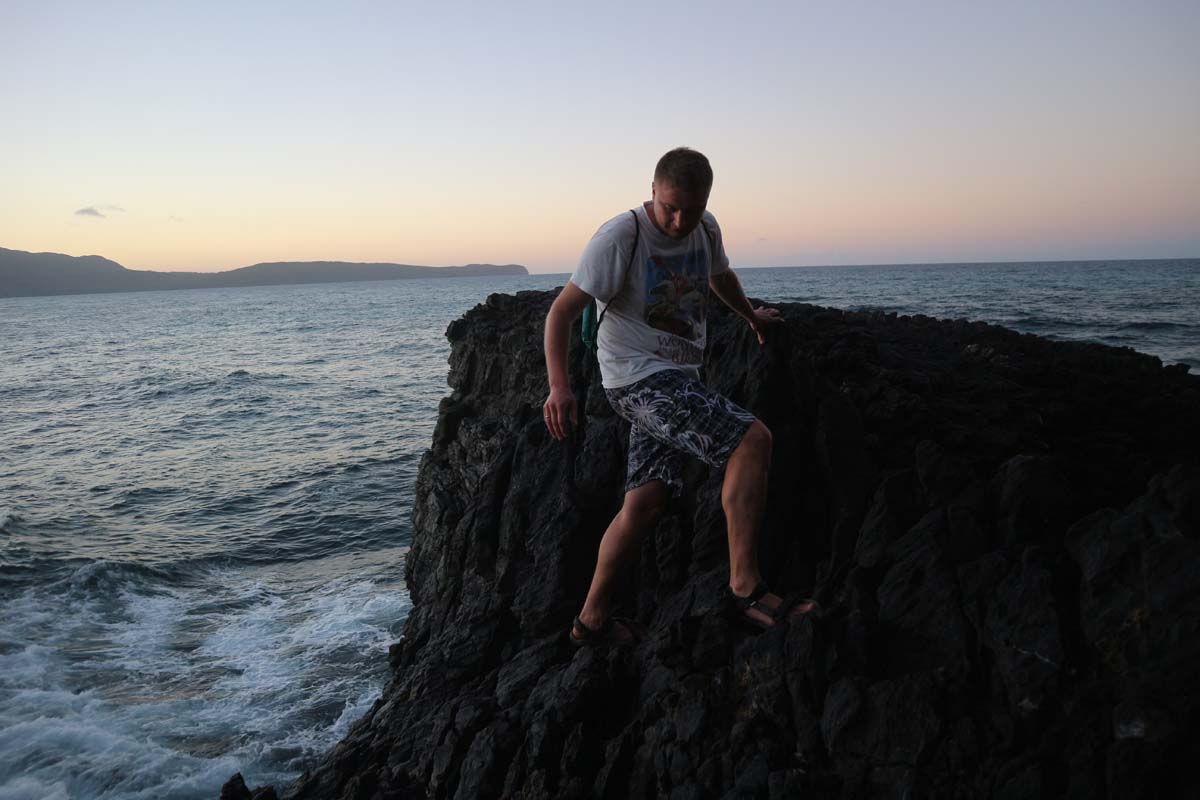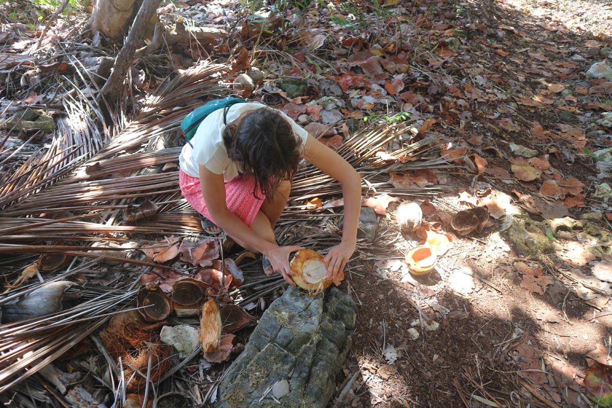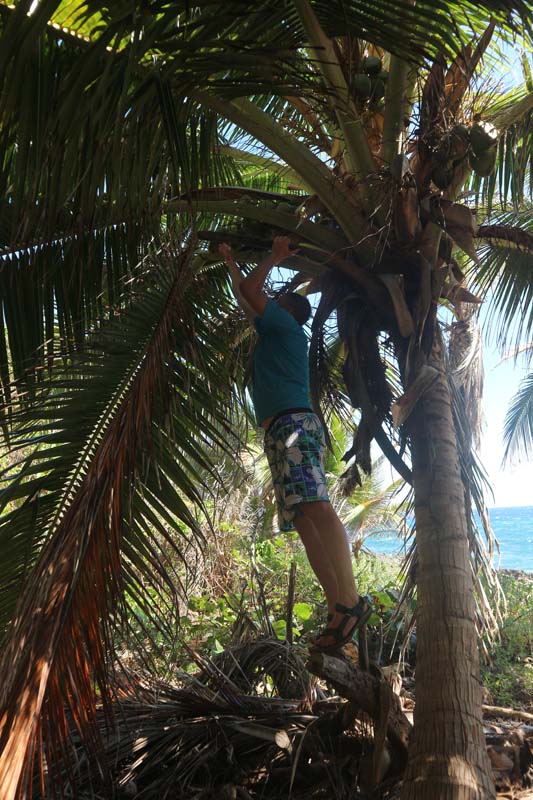 Бачили, як робітники видобувають кокоси великими ціпками та за допомогою мачете. Ми їх про всяк випадок не відволікали і побрели далі. У нас був чудовий пікнік на скелях. Ми дісталися чергового виходу високо над морем. Далі почався процес добування кокосів, вони росли досить високо на пальмах. Нам вдалося знайти таку пальму, біля якої лежала колода. Хвилин 10 у мене пішло щоб пальцями потроху прокручувати кокос за годинниковою стрілкою, але відвалюватися він не збирався.