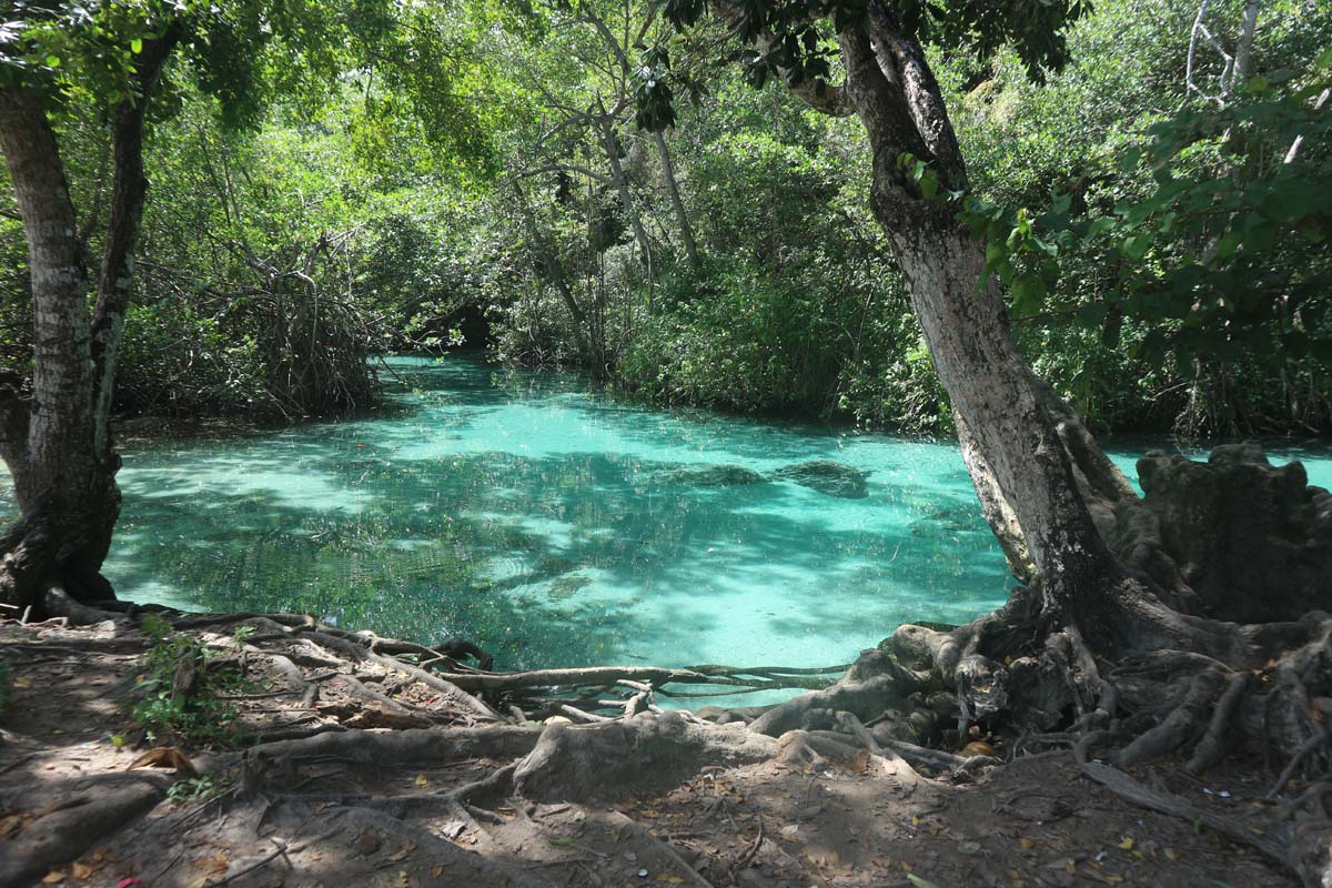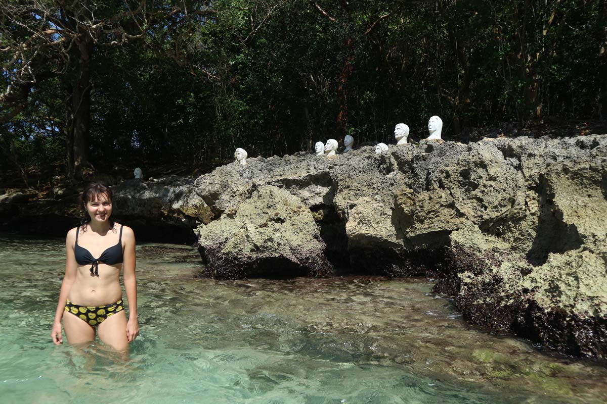 Це просто на диво красивий пляж, напевно, один з найкрасивіших, що ми бачили за цю поїздку. З дуже прозорою водою. Людей небагато, продається недорога їжа. За кілька кілометрів є траса, де ходить маршрутка. Наш гід висадив нас, щоб ми покупалися. Ми, тверезо оцінивши ситуацію, подякували гіду за екскурсію та відправили його назад вже без нас. Тут не те що хочеться плавати, жити хочеться в такій красі. Ще й круті окуляри під водою знайшов. Загалом пощастило. Прямо на пляжі продавалося купа місцевої їжі, ми зробили акцент на чебуреках, а на десерт була прекрасна “Піна Колада” в ананасі. Я правда трохи побачив таїнство її приготування в антисанітарних умовах і мене мало не відкачувати довелося. Але було смачно і ми живі! За кількістю з’їдених чебуреків ми значно підняли економіку пляжу того дня. Тим часом на пляж під’їжджали дикі туристи і ми мали несподівані та радісні зустрічі з різними людьми, з якими ми перетиналися раніше на маршрутах в інших містах. На пляжі провели щонайменше пару годин. Нам, звичайно, це не властиво, пляж, море і ми навіть годинами купаємось. Проте було так гарно, що якщо винайдуть портали, то я обов’язково туди ще раз повернуся. На скелях, що оберігали бухту пляжу, були заховані ряди білих кам’яних голів, які дивилися у бік моря. Ми вирішили йти на трасу не прямим шляхом дорогою, а скоротити через мангровий ліс.