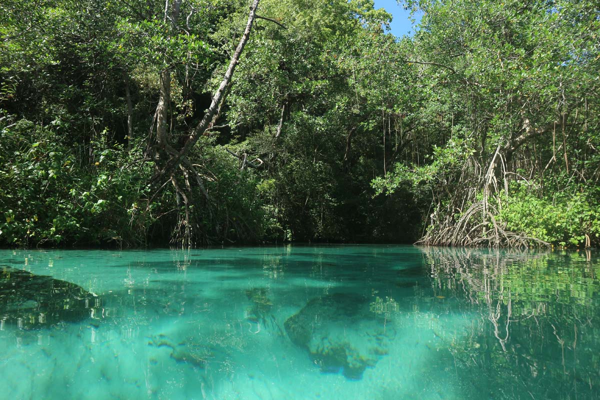 Дуже гарне місце, де вона впадає в море, але ми зробили трохи цікавіше, піднялися за течією, знайшли вхід і попливли метрів 300 вздовж мангрових заростей у бік моря. Дуже гарна вода, з обох боків джунглі, зверху часом звисають ліани. Трохи страшно, раптом тут водяться якісь крокодили. Ще через те, що нам нема де залишити речі, потрібно плисти по черзі.