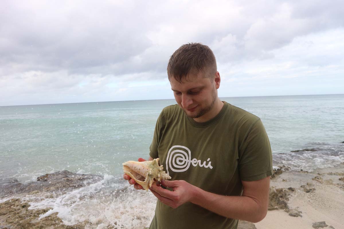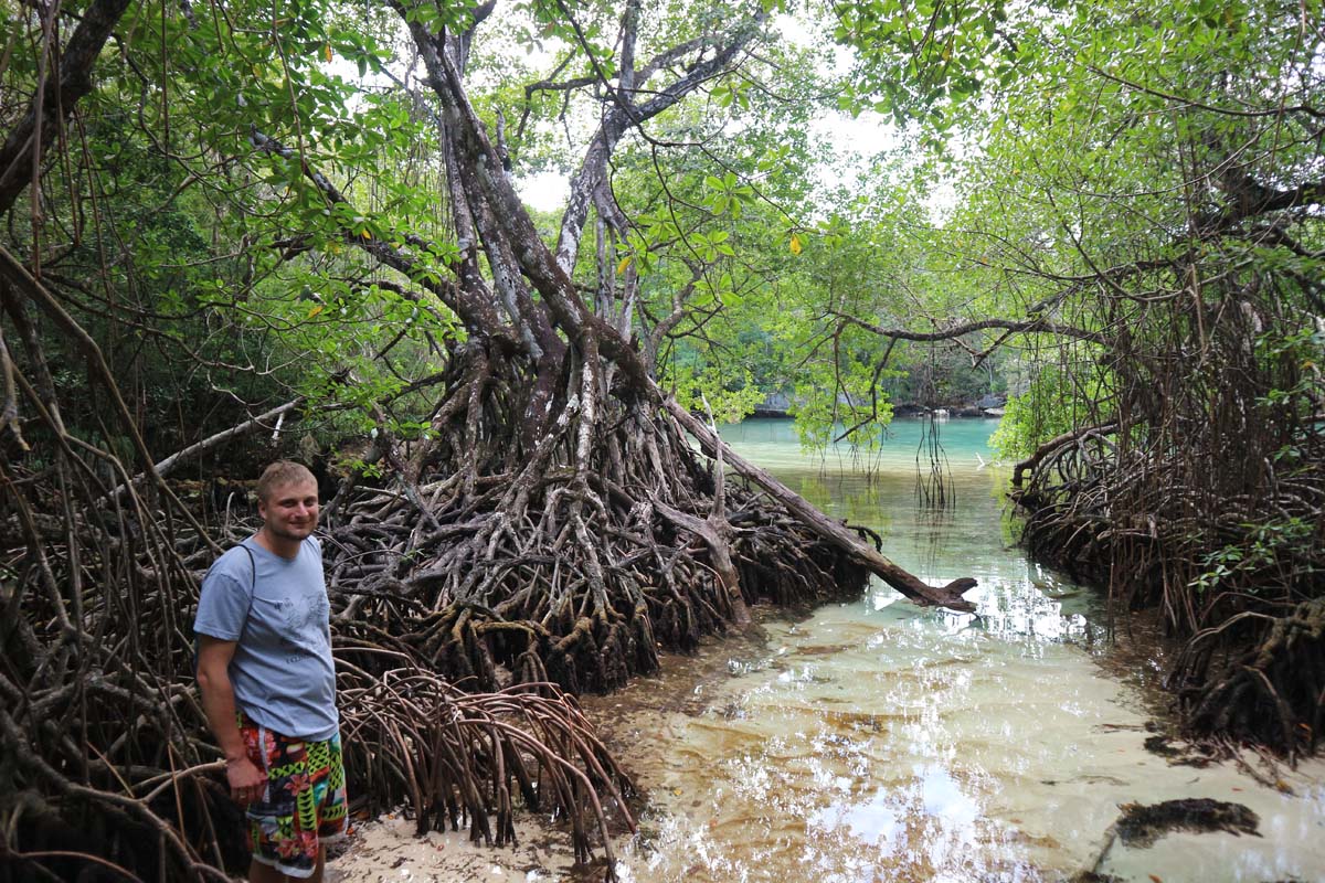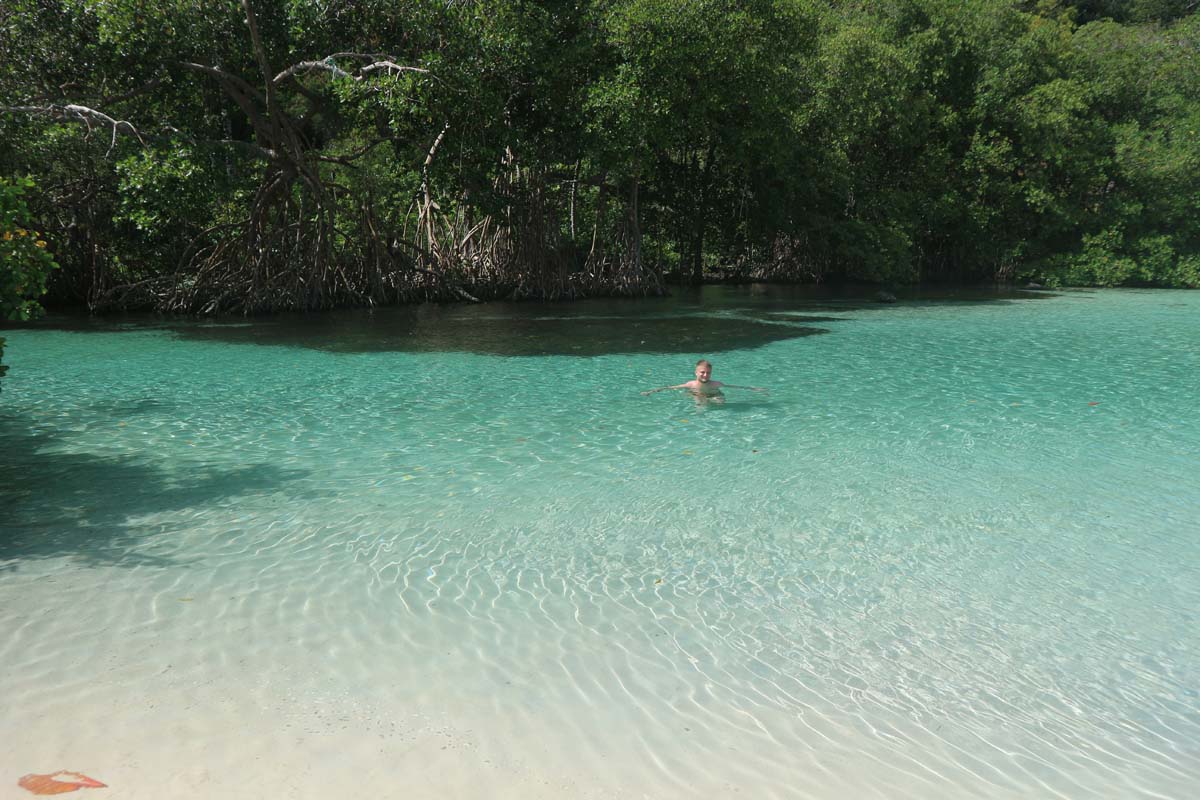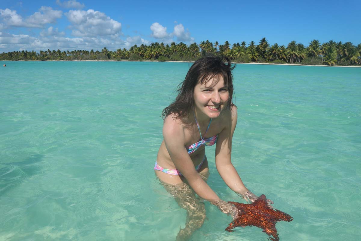 На цьому пляжі ми, до речі, у воду так і не залізли, було досить гарно і радісно просто перебувати-існувати серед такої краси. Чергові дві години добігли кінця, а значить настав час рухати вперед. Наступна зупинка була серед моря біля мангрових чагарників. Ми вже багато, де бачили мангри, але так, щоб вони росли прямо серед моря у вигляді самостійного острівця без суші – це щось нове. Після мангрової зупинки була найочікуваніша. Нас висадили просто серед моря у природному басейні. Глибина була тут до пояса, вода прозора і ідеально красива, прямо як годиться. Але, найголовніше це місце проживання морських зірок. Але ж де зірки? Капітан заліз вище і показав мені напрям, у якому шукати. Ми одразу вирушили туди і вже за хвилинку я кричав від радості. Такі великі, такі шипасті, такі красиві!