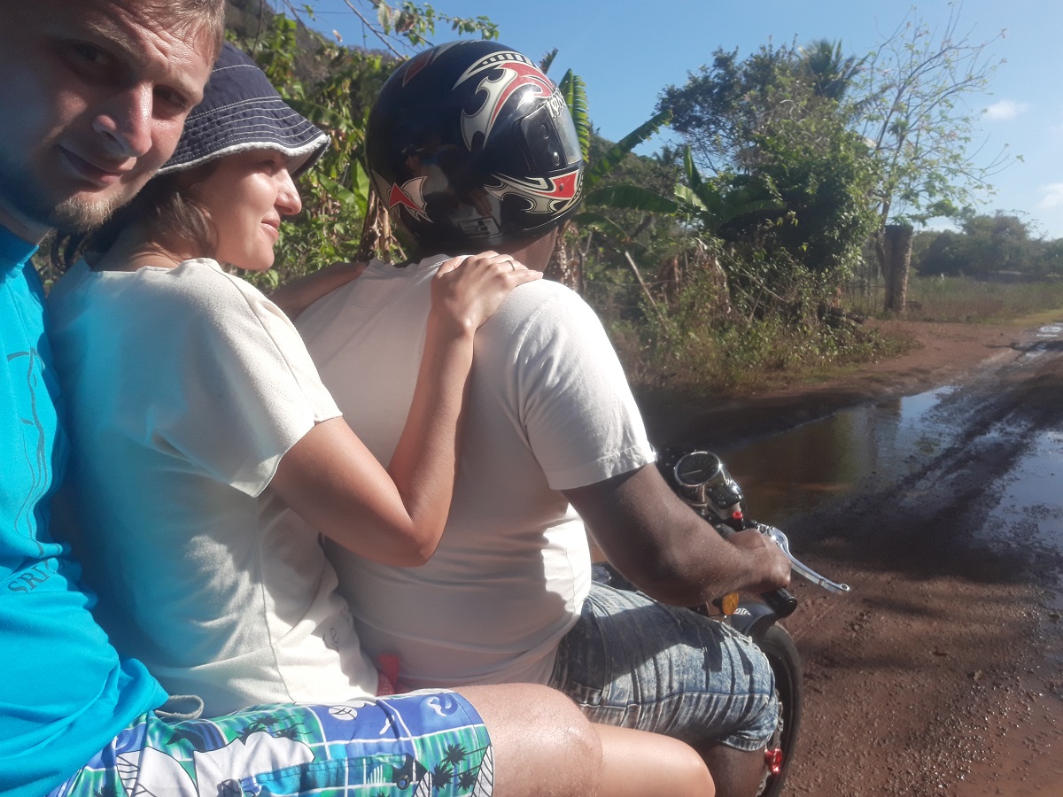 Вранці перетягли речі в інший Готель і вирушили в дорогу. Спочатку ми проїхали близько 7 кілометрів на маршрутці, потім довірившись картам попросили водія нас висадити біля роздоріжжя. До нас одразу ж підрулив місцевий мотоцикліст. І через пару хвилин ми вже мчали з вітерцем по вбитій дорозі вглиб джунглів. На одному мотоциклі помістились усі втрьох і на спині ще невелика похідна сумка. Їхати було щось зовсім нелегко, але багато ям та пагорбів. Деколи здавалося, що я везу мотоцикл, а не навпаки. Але треба було терпіти ці ще 7 пекельних кілометрів.