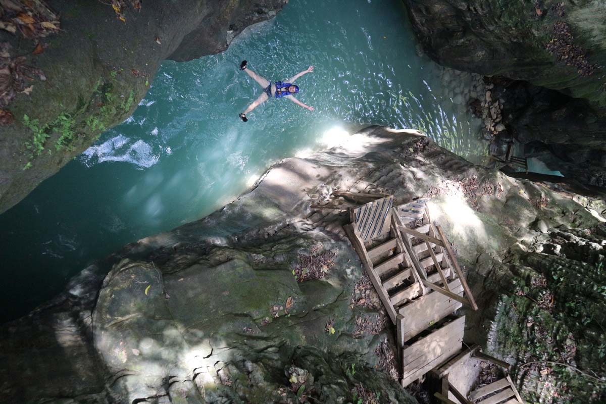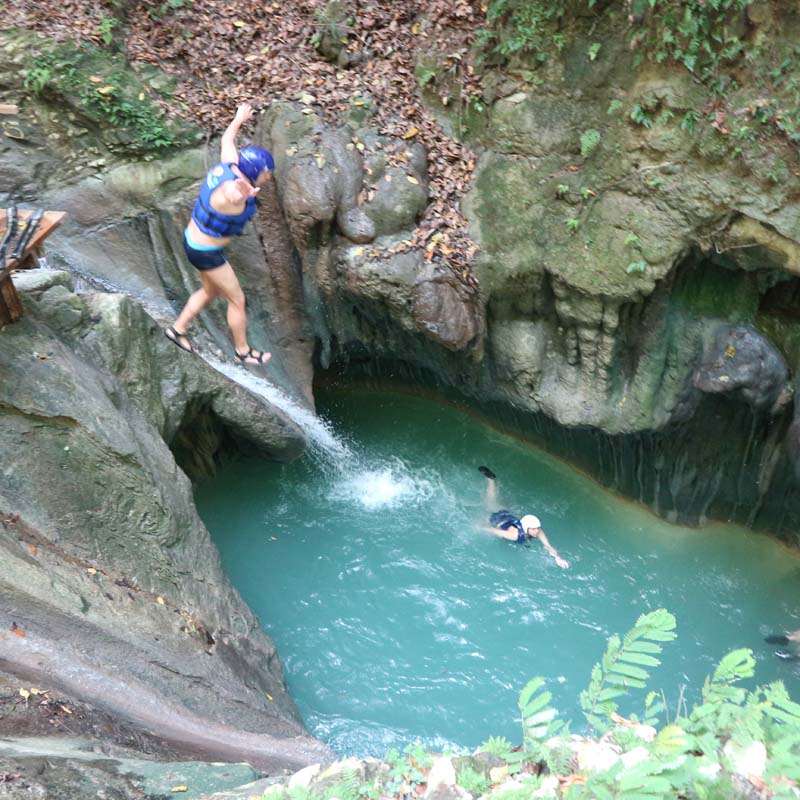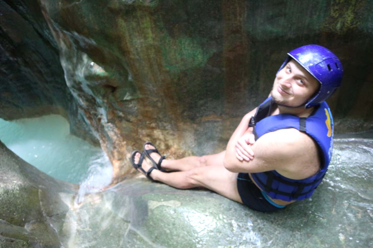 Я так зрозумів, що у лютому треба приїжджати не пізніше 11:30. Ми вибрали оптимальний маршрут із 12 водоспадів. Його всі радили. За маршрут потрібно заплатити по 550 песо з особи (11 $). На тебе надягають страховий костюм та призначають провідника. Провідник за 500 песо (10$) з радістю погоджується скрізь тебе фотографувати не втопивши твій фотоапарат. Спочатку хвилин 40 потрібно пройти в гору, потім ми підійшли до непрозорої блакитної річки під урвищем і він сказав, що можна починати. Це був не просто стрибок, це був стрибок сміливості! Але, на щастя, виявилося глибоко. Водичка бадьорячи – холодна.